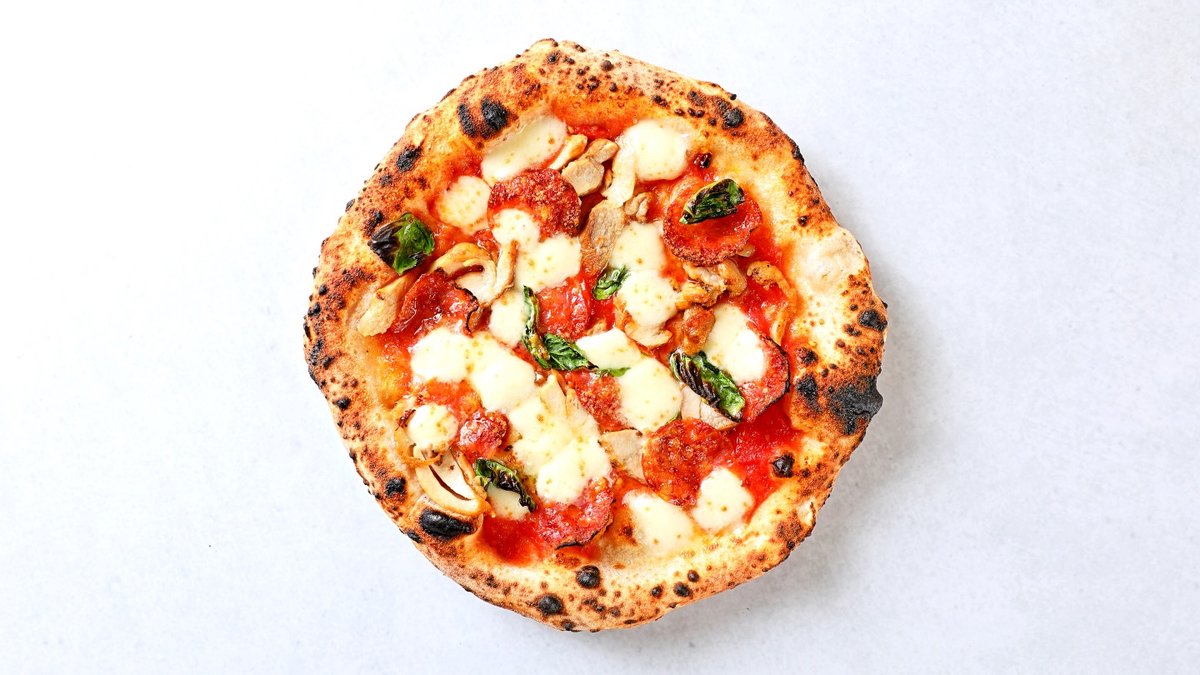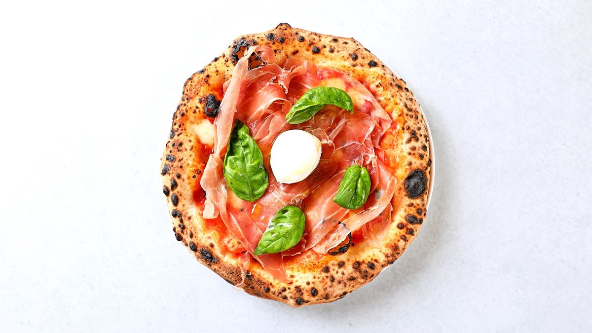 マルゲリータに生ハムを敷き詰め、真ん中に生の水牛モッツァレラをトッピングした贅沢なピッツァです。 生ハムの塩気が良いアクセントになっております。