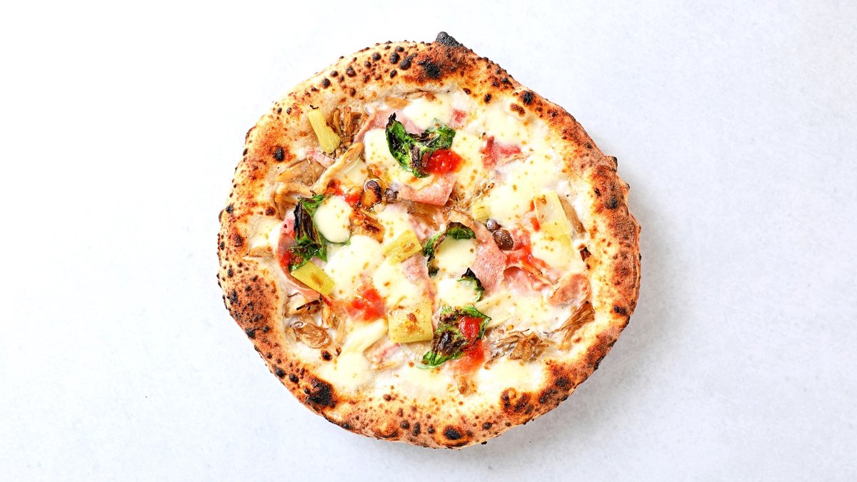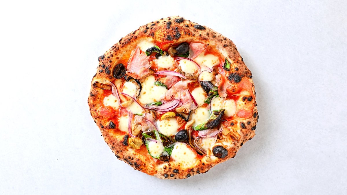 マルゲリータにイタリア産ハム、きのこソテー、オリーブ、スライスオニオンをトッピングした具沢山ピッツァです。