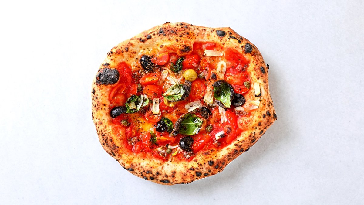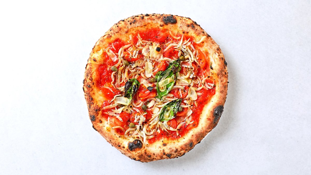 トマトソースにアンチョビ、オリーブ、プチトマト、オレガノ、バジル、スライスガーリック白ワインに合うようなパンチの効いたピッツァです。チーズは使用しておりません。