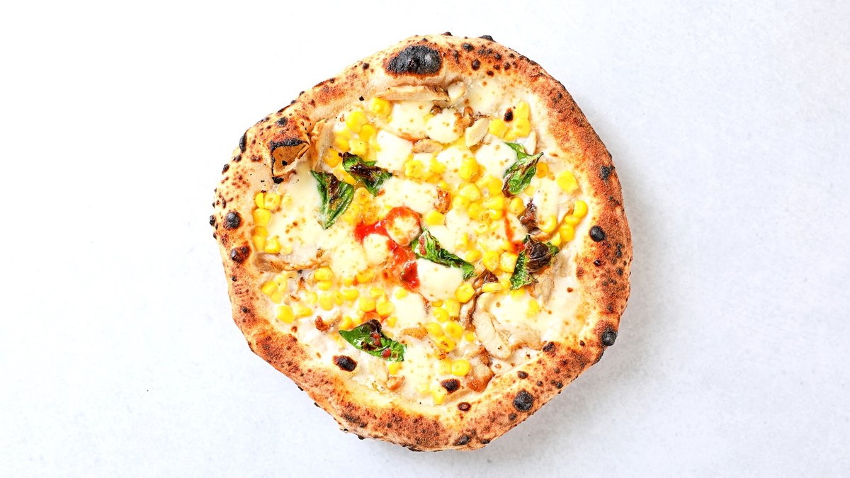 クリームソースにコーンとローストチキンをトッピングしました。 お子様に人気のピッツァです。