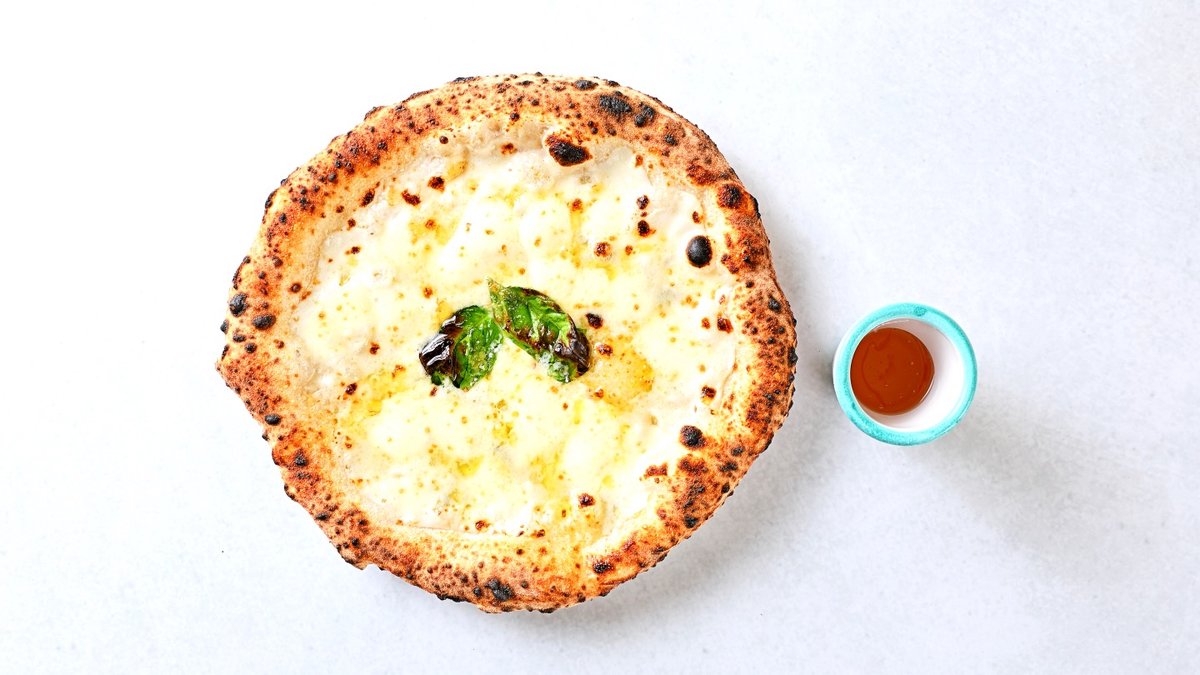 4種類のチーズ(モッツァレラ、ゴルゴンゾーラ、エダムチーズ、グラナパダーノ)を使用した女性に人気のピッツァです。付属のハチミツをお好みでお使いください。