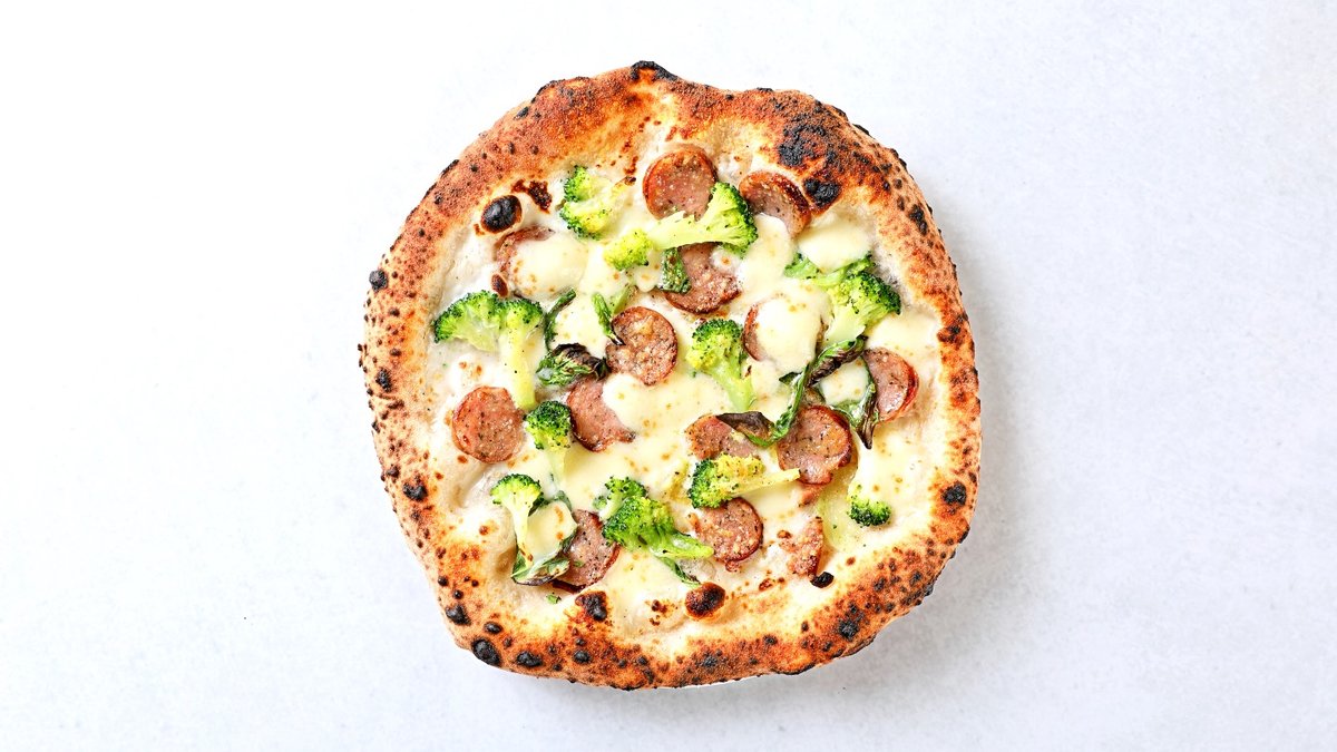 クリームソースにブラックペッパーを効かせ、大振りにカットしたソーセージとブロッコリーとモッツァレラをトッピングしました。