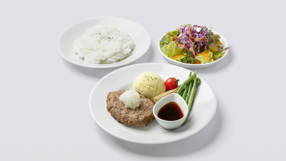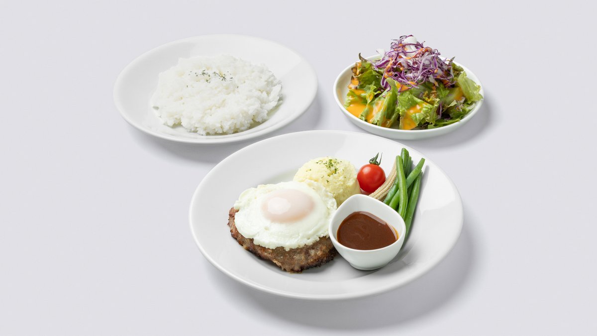 ふっくらとしたハンバーグに、まろやかな目玉焼きを添えました。やさしい味わいです。/ A fluffy Hamburger Steak topped with a mild fried egg. It offers a gentle flavor.