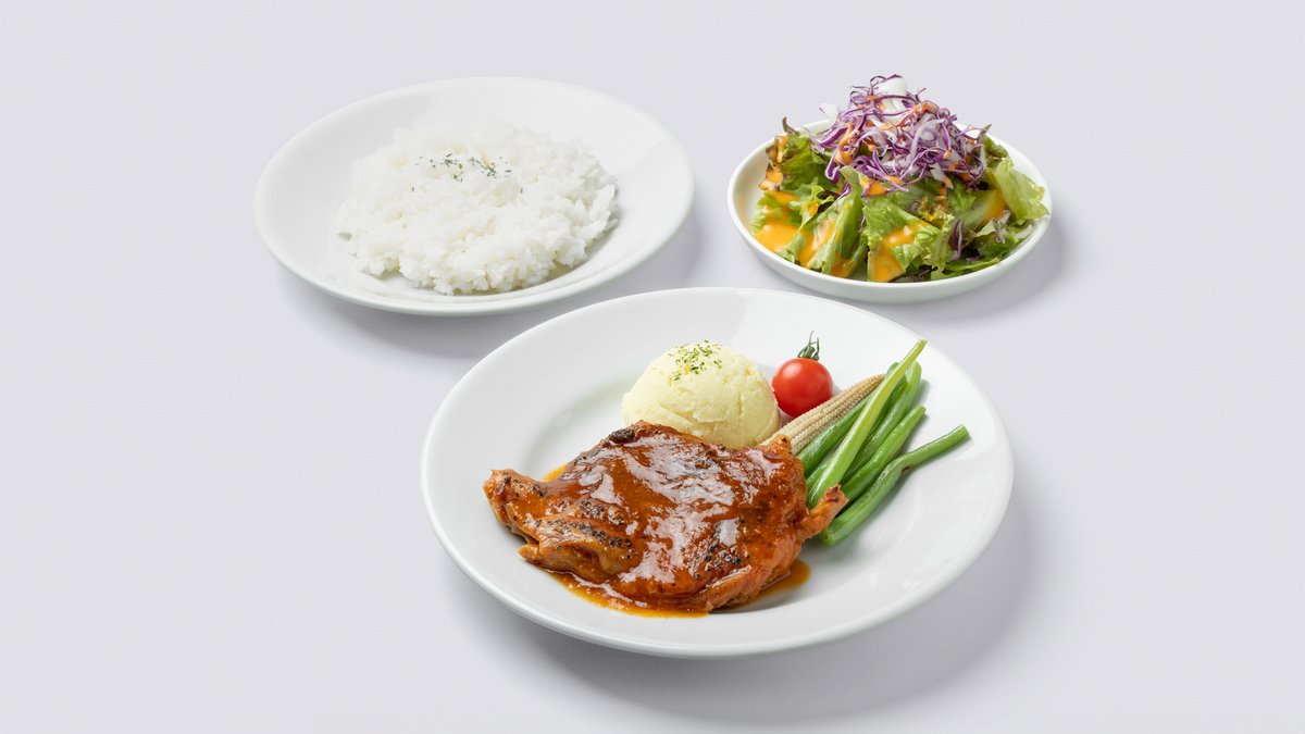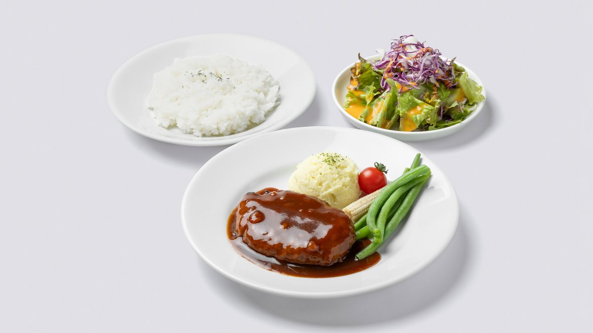 濃厚で奥深いデミグラスソースが、ジューシーなハンバーグの旨味を一層引き立てる一品です。/ A juicy Hamburger Steak enhanced by a rich and profound demi-glace sauce.