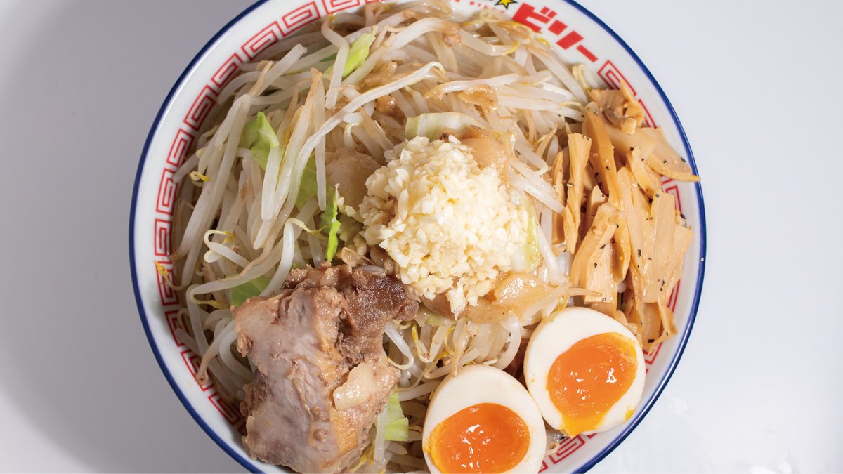 極厚の豚と山盛りの野菜、ニンニクを乗せ、ボリューム満点のラーメンをご提供しています🍜