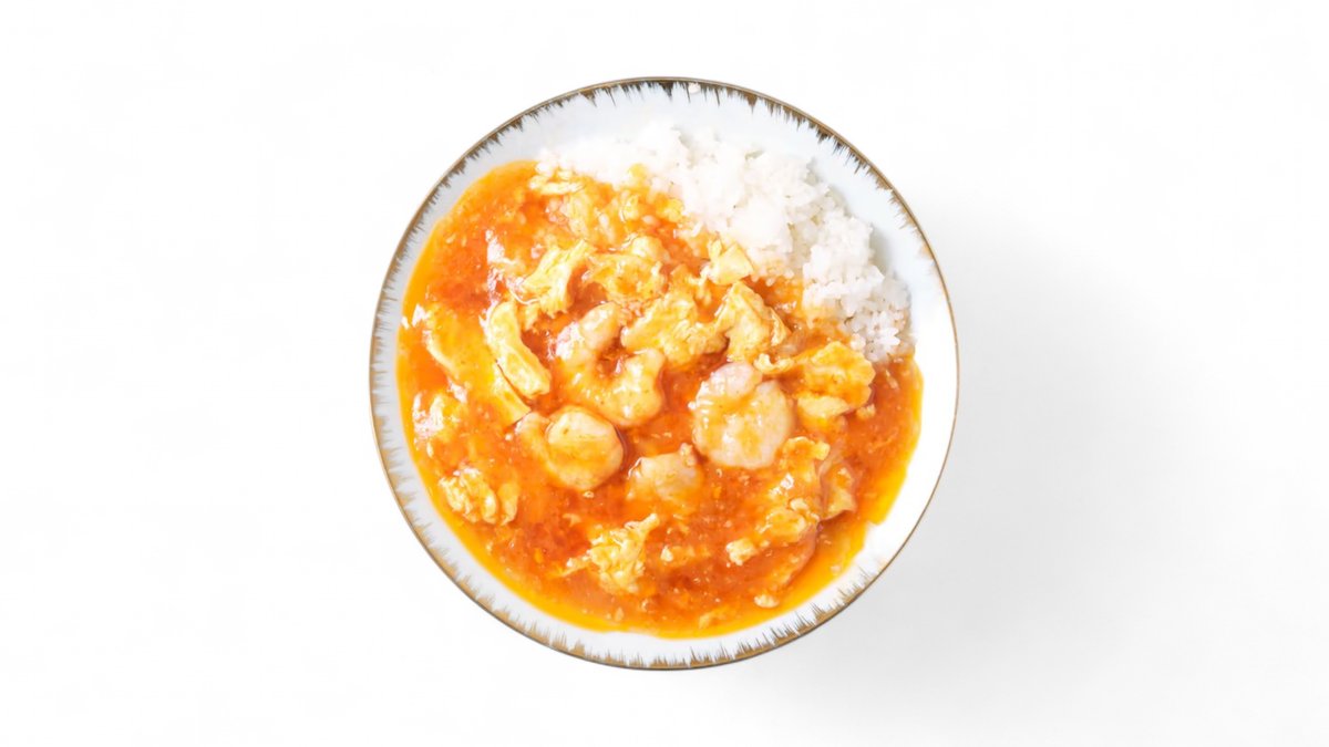ふわとろ玉子と海老のピリ辛チリ丼。ふんわり玉子とぷりっとした海老を甘辛チリソースで仕上げ、ご飯に合わせたやみつき丼です。