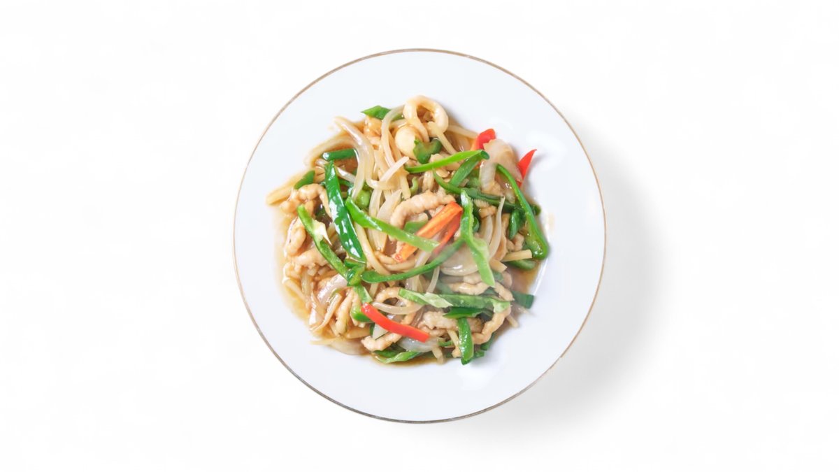 シャキシャキ野菜と細切り肉を香ばしく炒め、濃い旨みが楽しめる定番料理です。