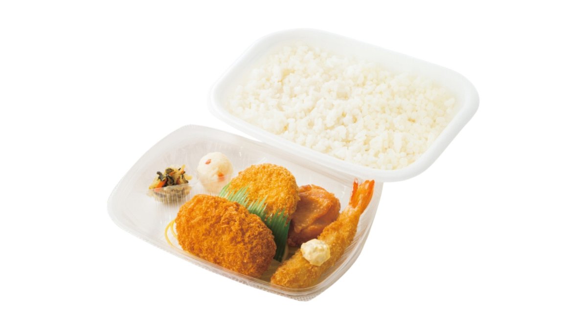 人気ナンバーワン商品『のり弁当』のおかずを豪華にしました。 「から揚」「白身フライ」「メンチカツ」「きんぴら」「たくあん」をトッピング。 商品内容、容器が異なる場合が御座います。