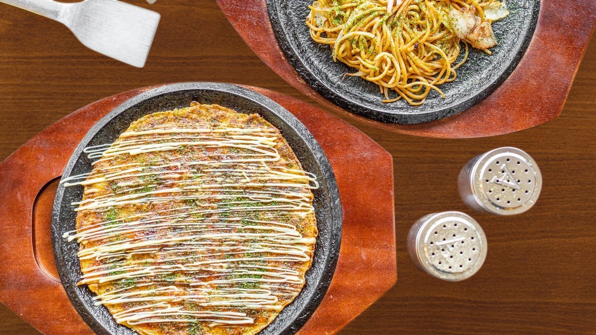 外はカリッと中はふわふわなスタンダードなお好み焼きや広島焼き、ソースが絡んだもちもち麺の焼きそばをご用意しています🇯🇵
