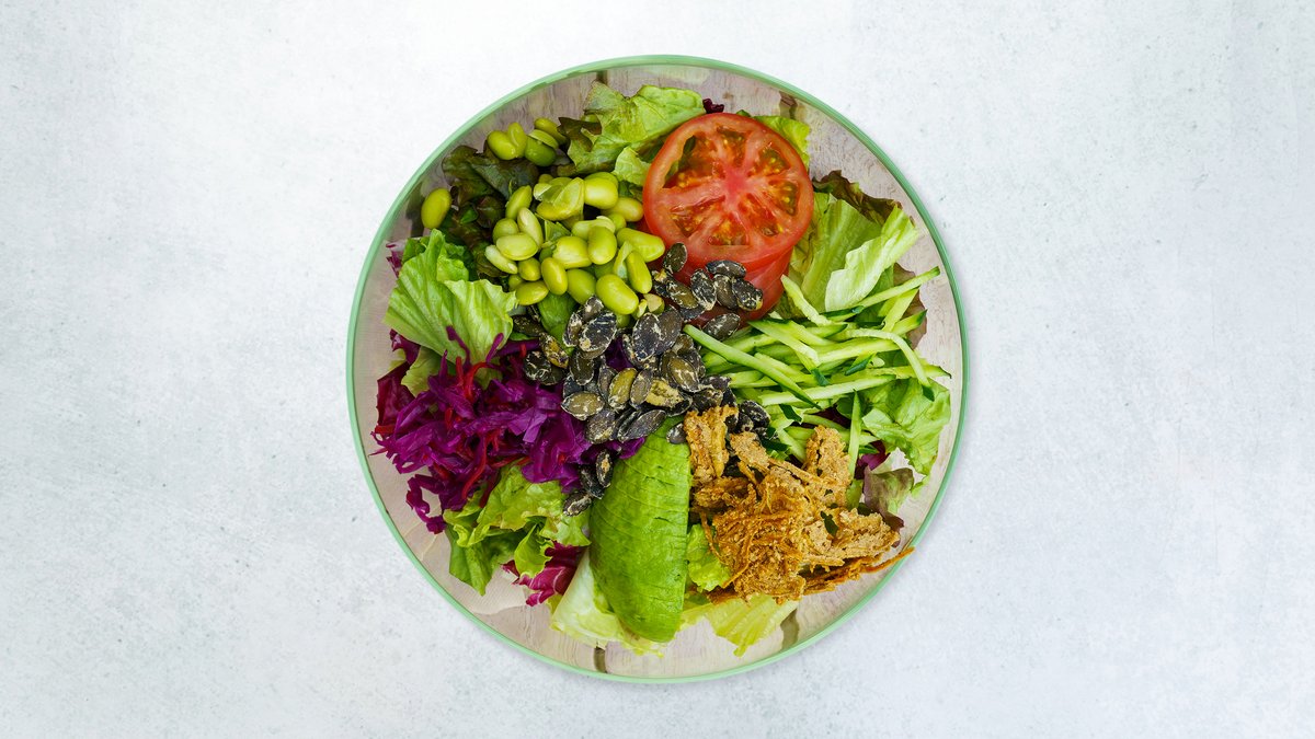 ミックスグリーン、キュウリ、ピンクザワークラウト、トマト、アボカド、エダマメ、パンプキンシード、クリスピーセサミオニオン、ハーブヴィネガードレッシングを使用しています。