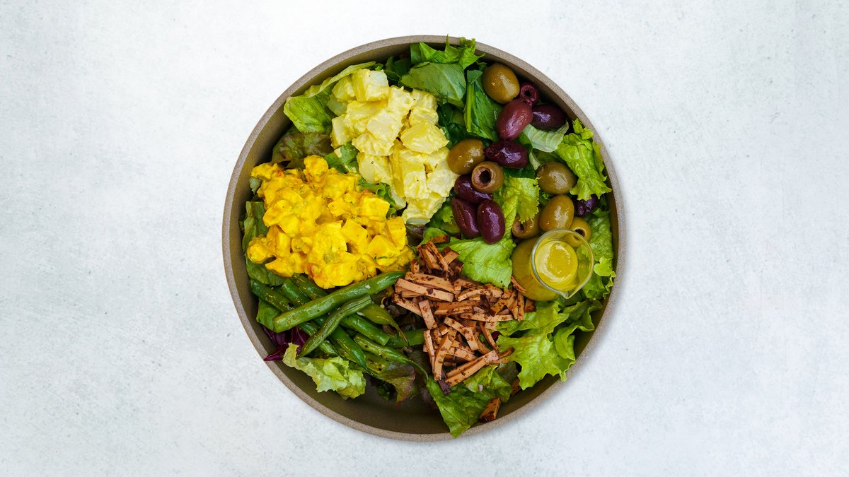 ミックスグリーン、ほうれん草、ポテトサラダ、インゲン、オリーブ、豆腐のエッグ サラダ 豆腐ツナ、ハーブヴィネガードレッシングを使用しています。