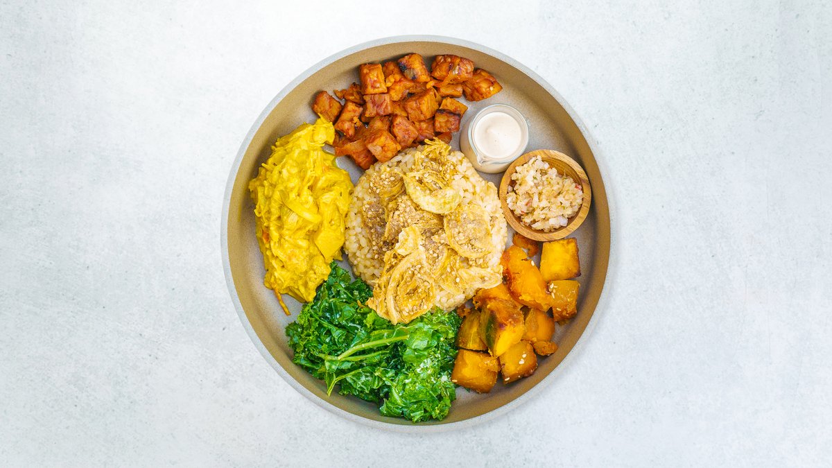 玄米、ジャックフルーツチキン、焼きカボチャ、ケールタヒニ、サンバル マタ、クリスピーセサミオニオン、タヒニレモンドレッシングを使用しています。