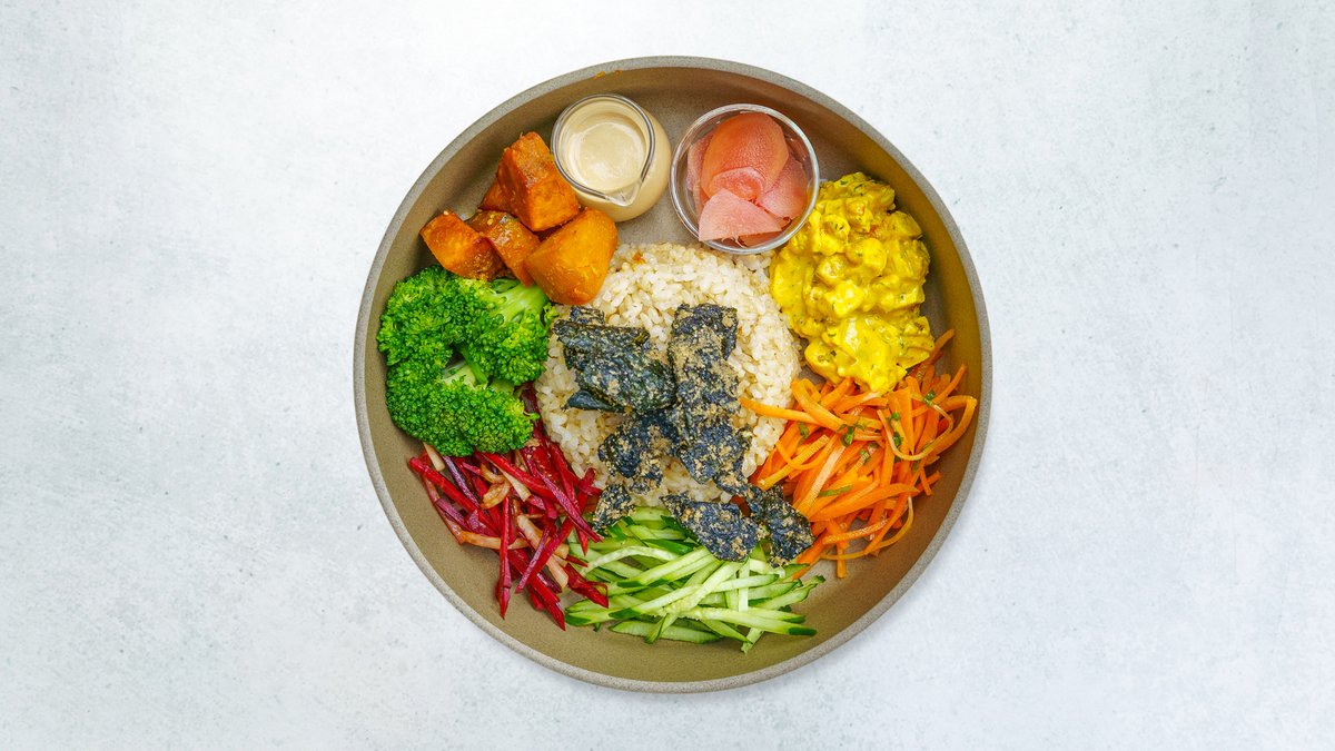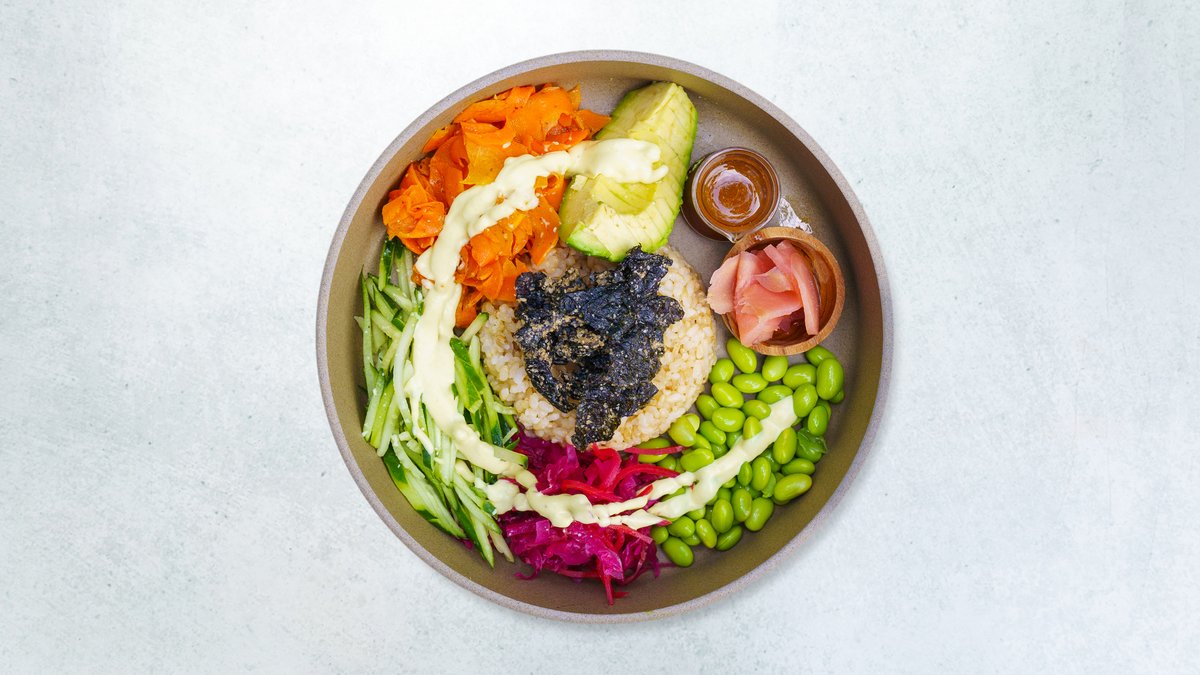 玄米、キュウリ、エダマメ、アボカド、ピンクザワークラウト、燻製ニンジン、生姜のピクルス、こま海苔、ヴィーガンマヨネーズ、アジアンヴィネグレットドレッシングを使用しています。