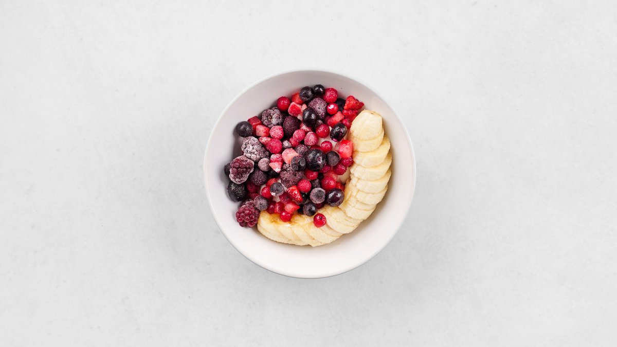 濃厚でクリーミーなグリークヨーグルトの上に、新鮮なバナナスライスとさまざまなベリーをたっぷりと乗せた、ヘルシーなデザート。果物の自然な甘さとヨーグルトのコクが調和し、さっぱりとした満足感のある一品
