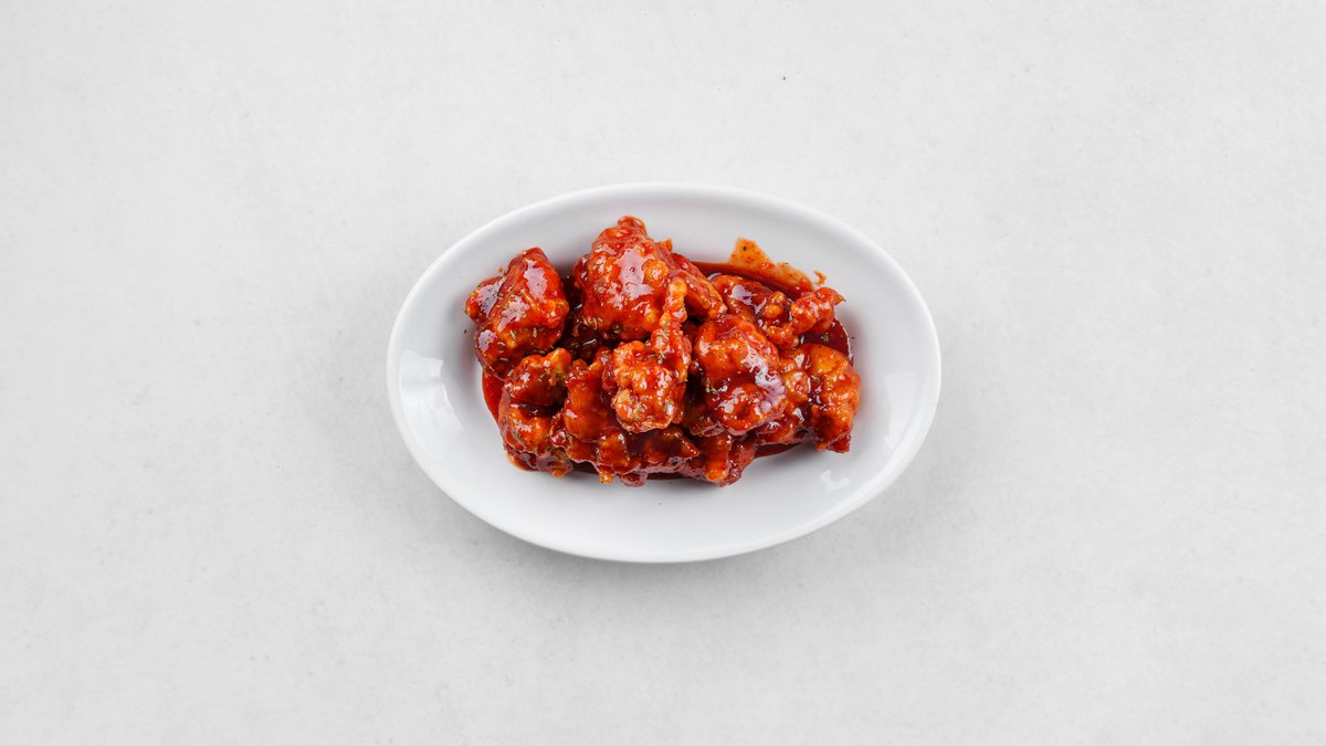 甘辛いヤンニョムソースを絡めた骨なしチキン。ピリッとした辛さと甘さがやみつきになる韓国風チキン。