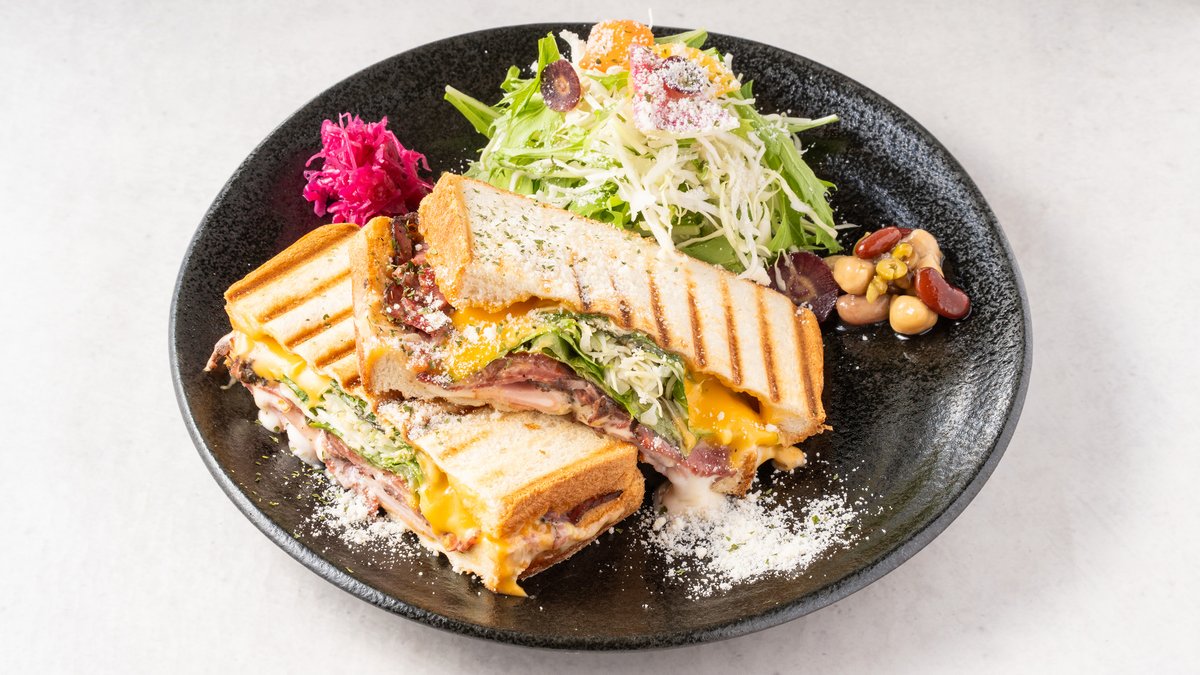 当店大人気のホットサンドとリッチなカフェラテのセットです。