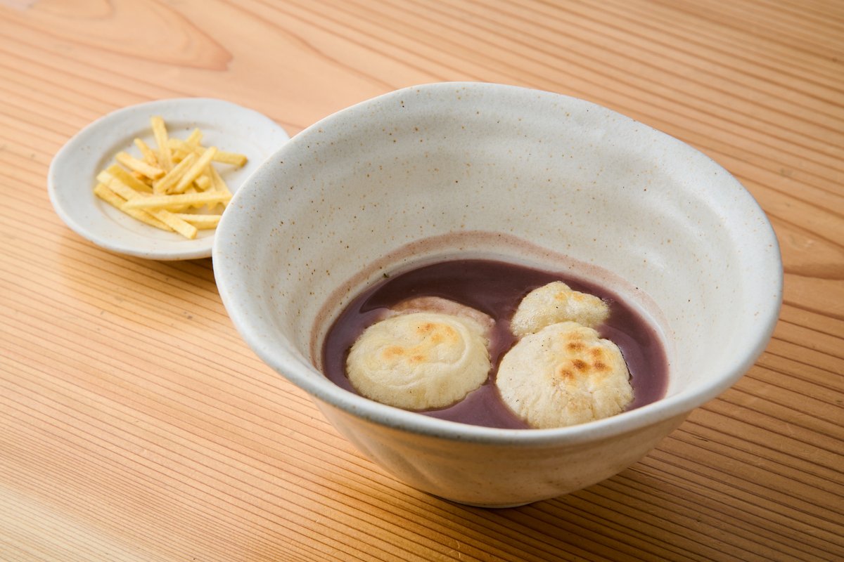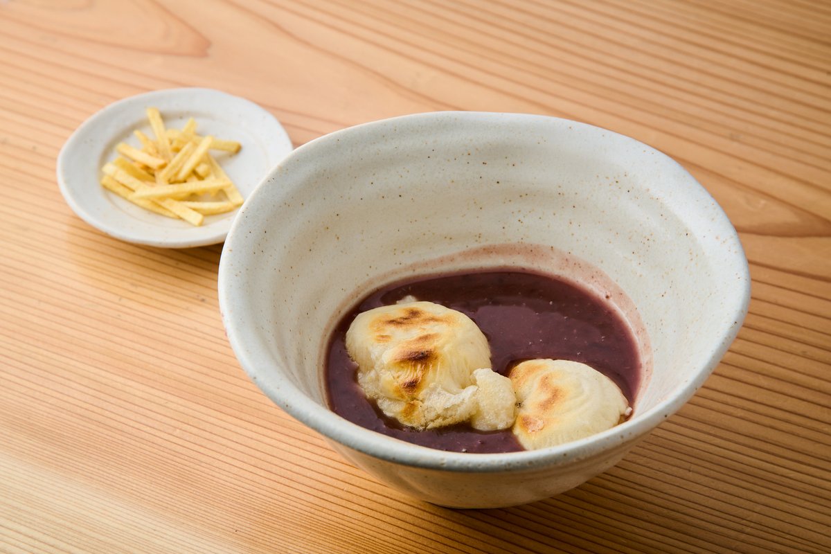 ancolocafe特製のつぶあんで作ったぜんざいです。甘さ控えめでおもち本来の味を引き立てます。おもちは直前にお焼きしてご提供いたします。おもちの伸び感もお楽しみください。