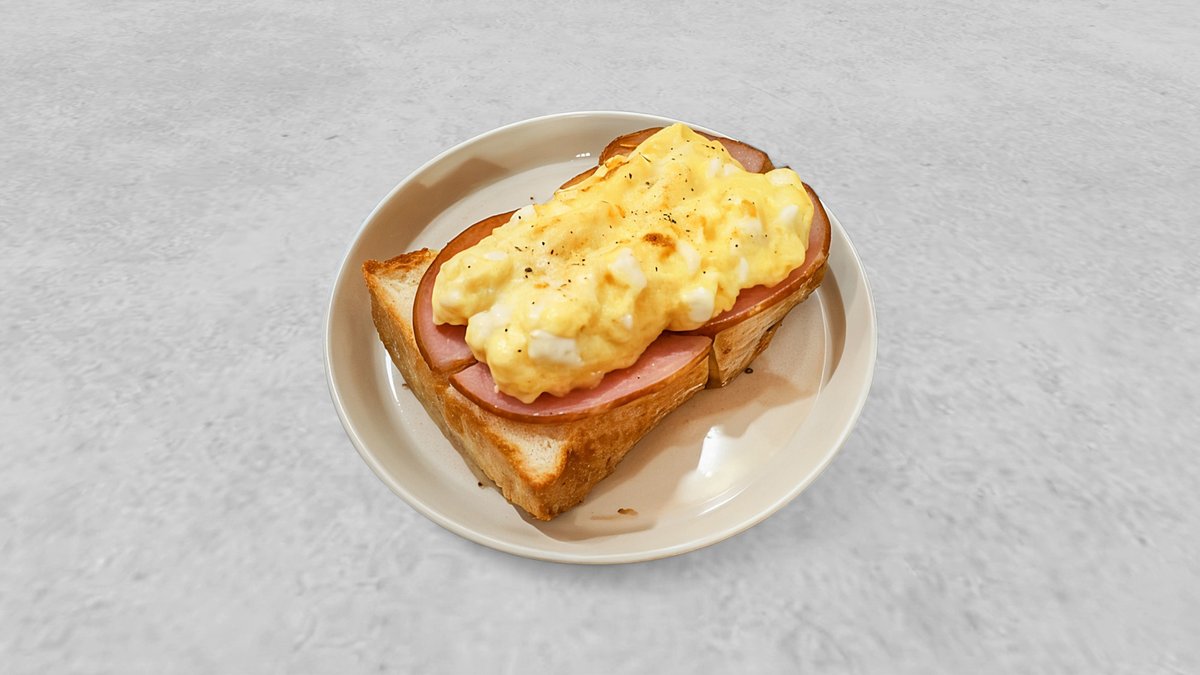厚切りトーストの上に、たっぶるのとろけるチーズと、アスパラガス、玉ねぎ、ソーセージを載せた、定番ピザトースト。