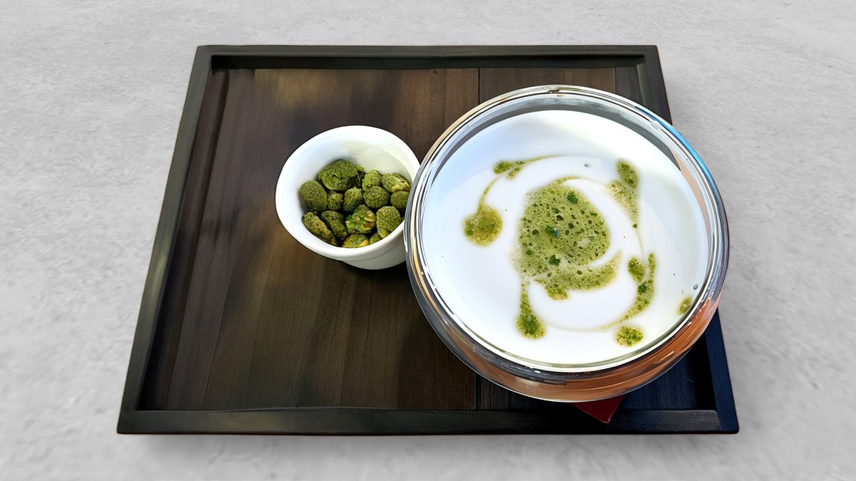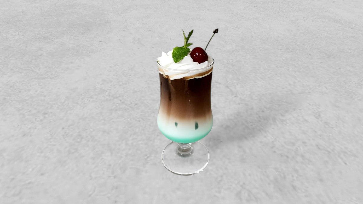 ミントシロップとコーヒーのモクテル。ノンアルコールだから、誰でも気軽に楽しめる! ※現在のトッピングはシロップ漬けのサクランボです。
