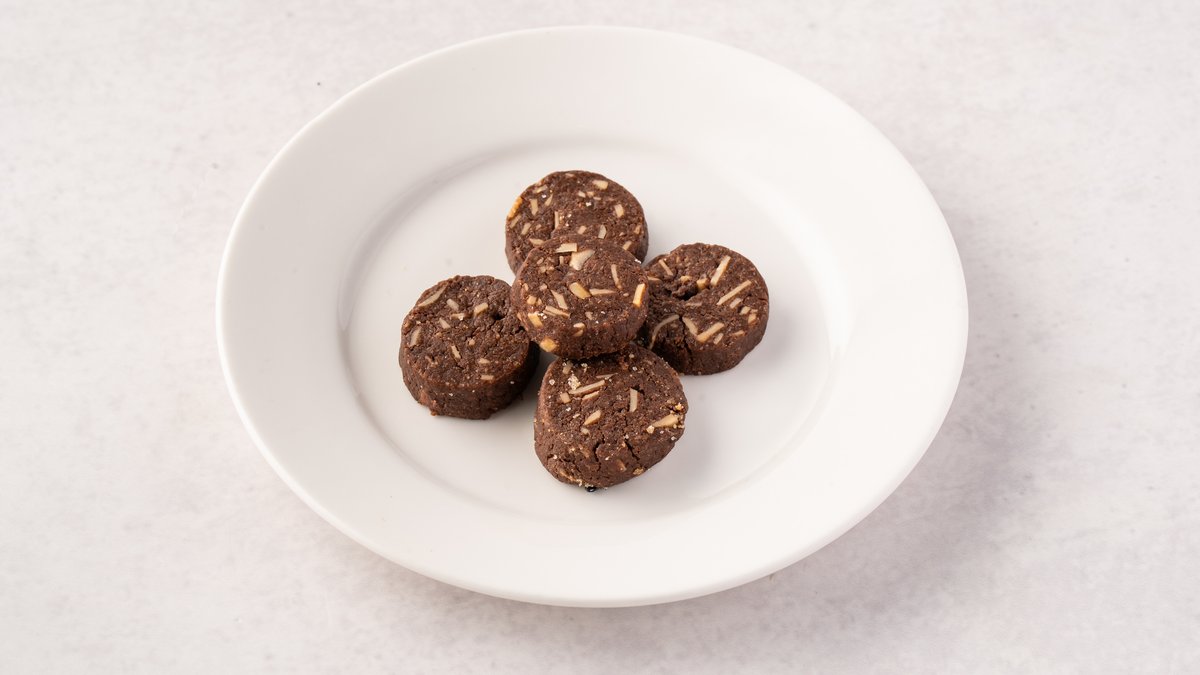 ココア生地にスライスアーモンドを練りこんだ、香ばしく軽やかな食感のクッキーです。
