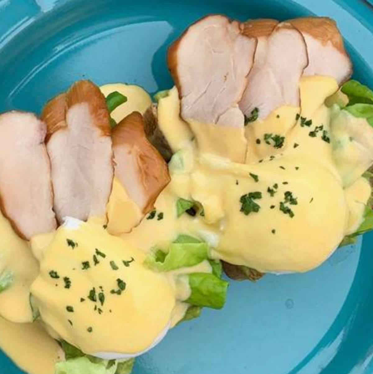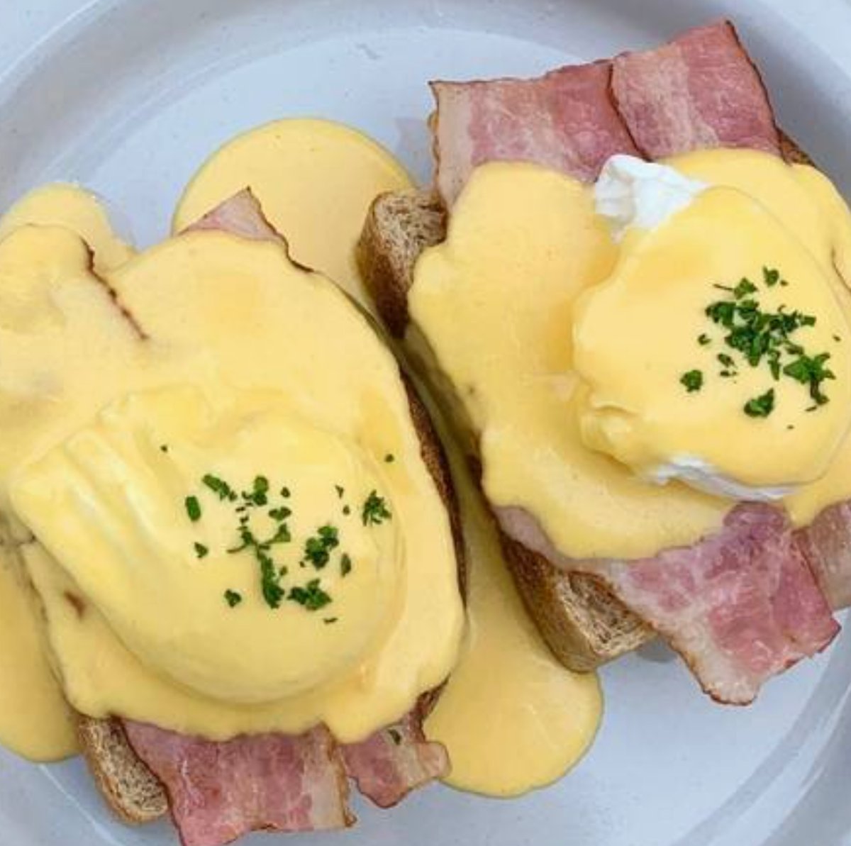 自家製全粒粉ブレッド、ベーコン、ポーチドエッグ、特製オランデーズソースを使ったオープンサンドです。