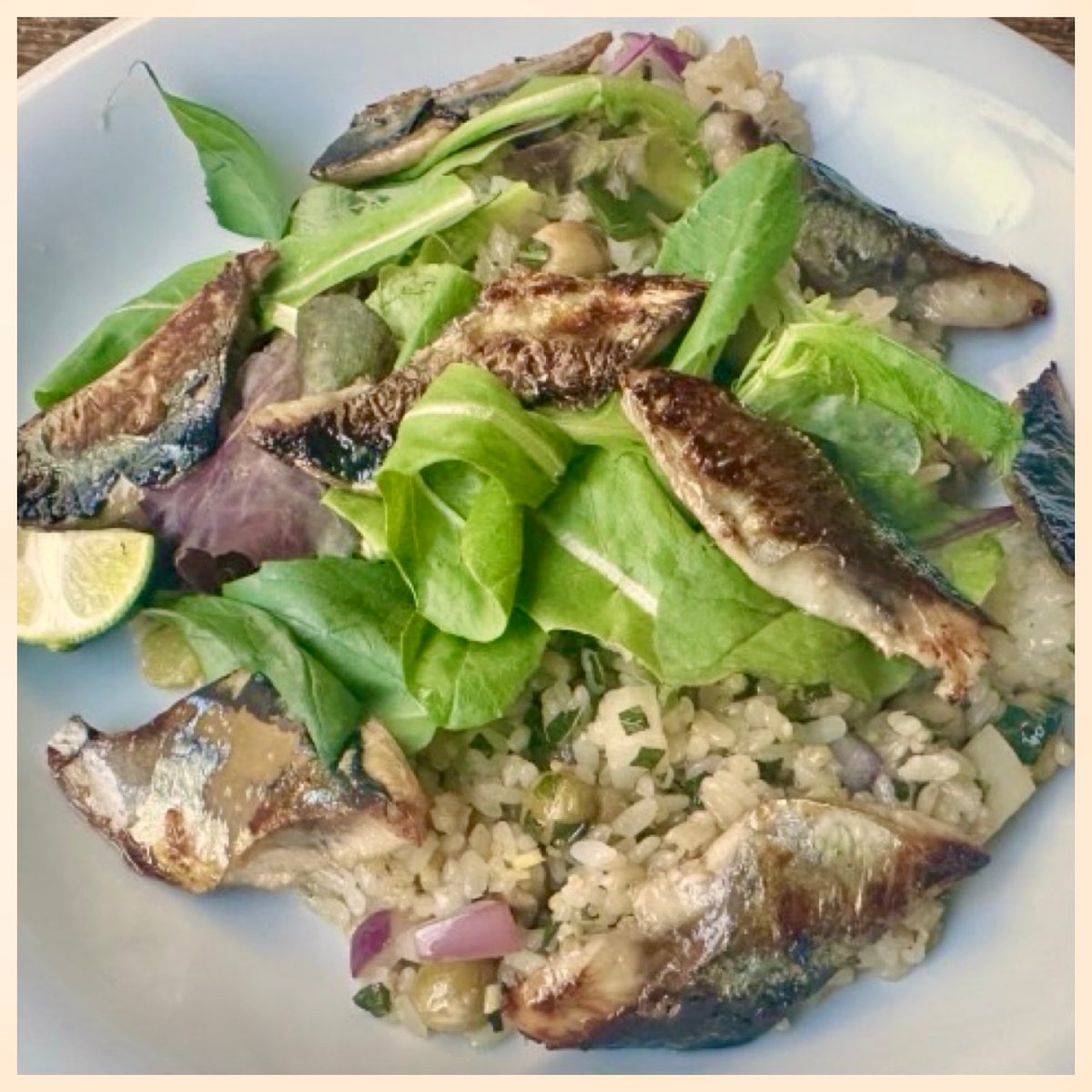 秋刀魚の麹漬け焼きのせ蓮根と大葉と3種の豆のフライドジンジャーバターライス すだち添えLotus root, green siso leat & 3 kinds