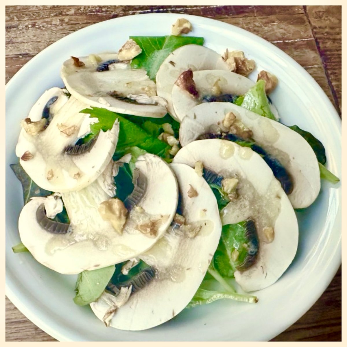 スライスジャンボマッシュルームとベビーリーフサラダ 塩麹ドレッシングSliced jumbo mushroom & baby leaf salad with s