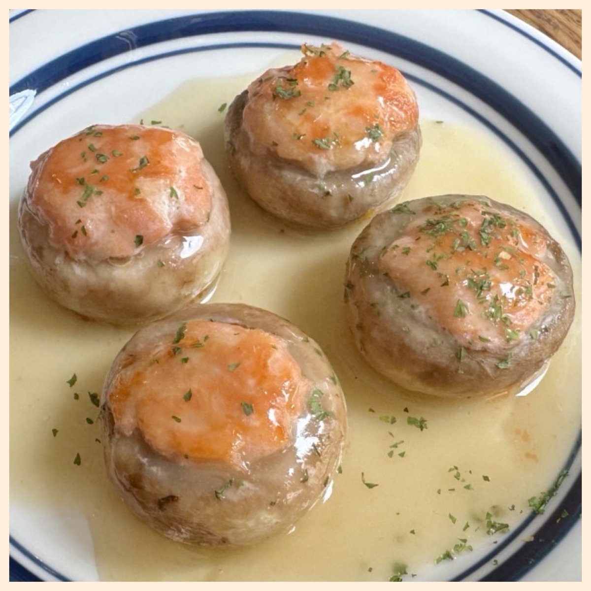 サーモンコンフィ詰めマッシュルームソテー白ワインバターソースSauteed stuffed jumbo mushroom with salmon confit