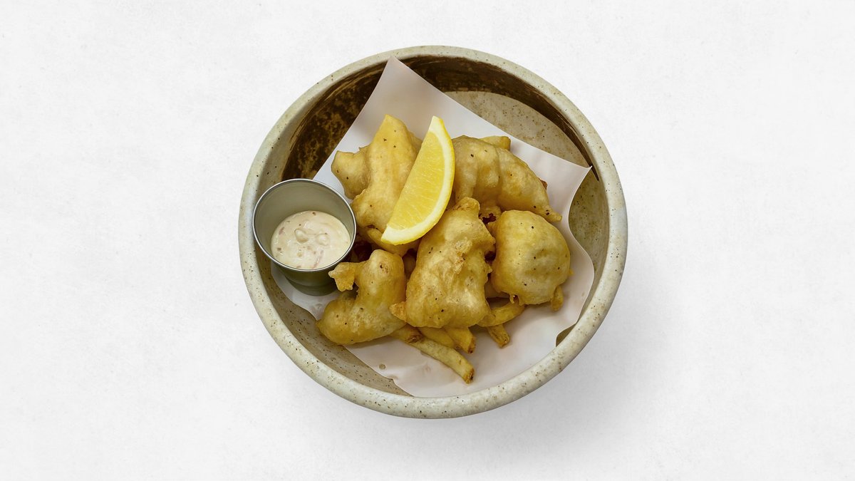 Hand cut daily, twice fried fries with Kaigan beer battered fish and tartare sauce 海岸醸造ビールで作った衣の白身魚と自家製ポテトフライ・タルタルソース付き
