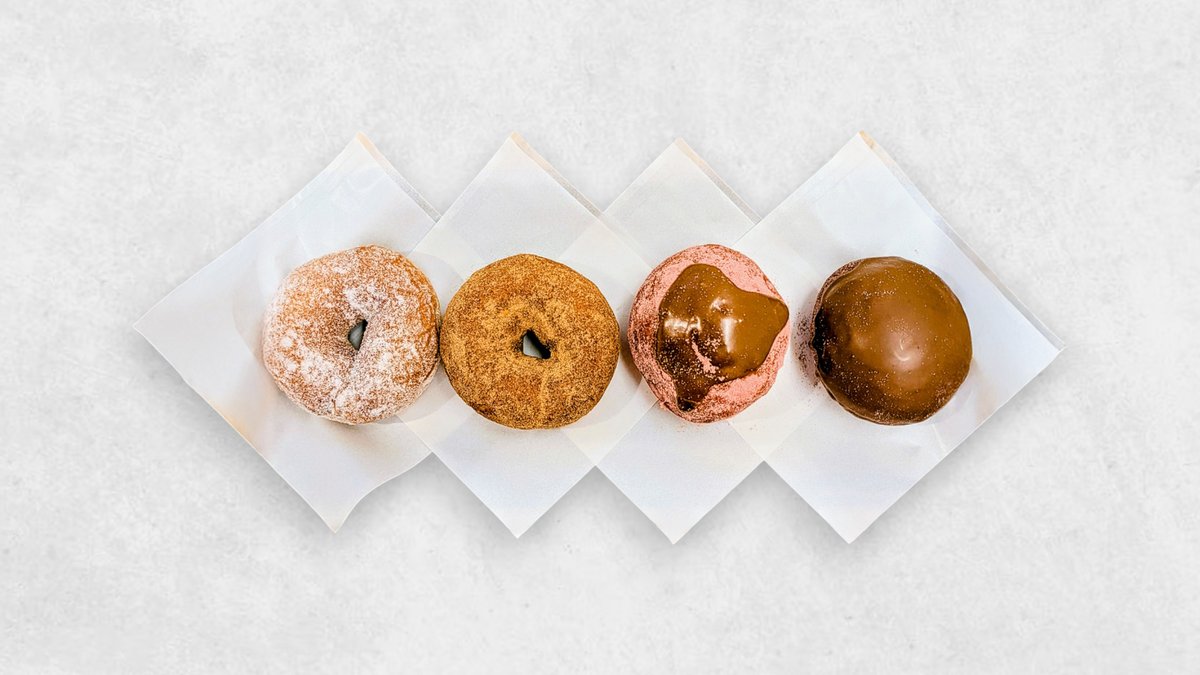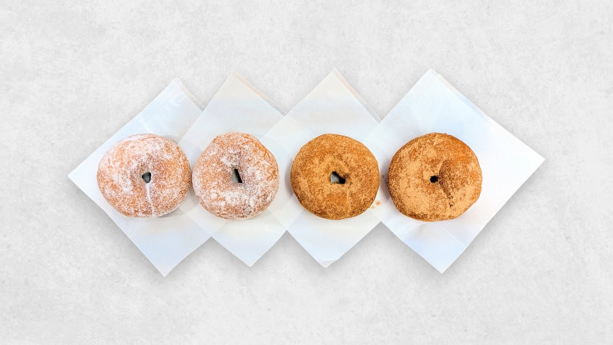 ドーナツシュガーで仕上げた基本のプレーンドーナツ2つと シナモンシュガーで仕上げたシナモンドーナツ2つ