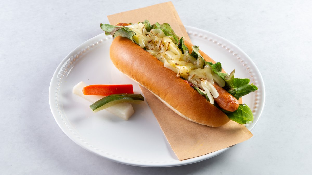 チーズが乗った人気のホットドッグです。