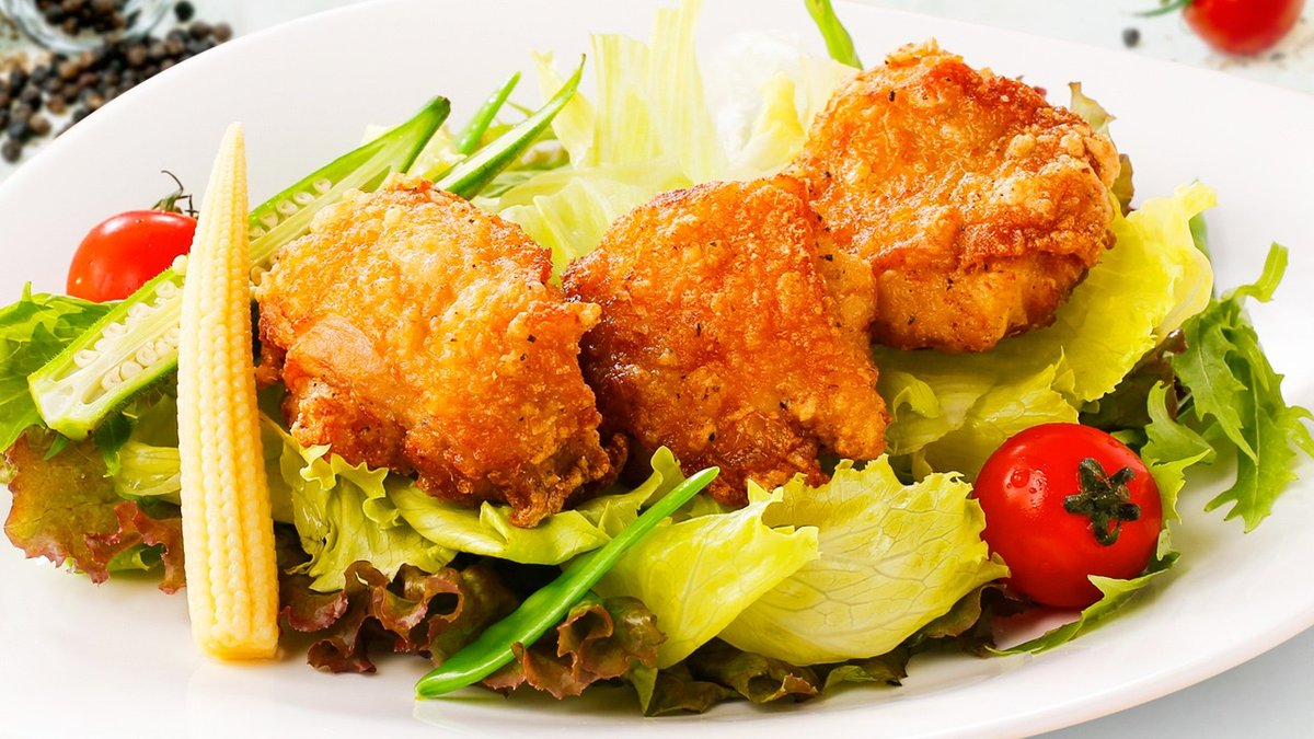 たっぷりの新鮮野菜に肉汁ジューシーな揚げたてのフライドチキンをのせました。