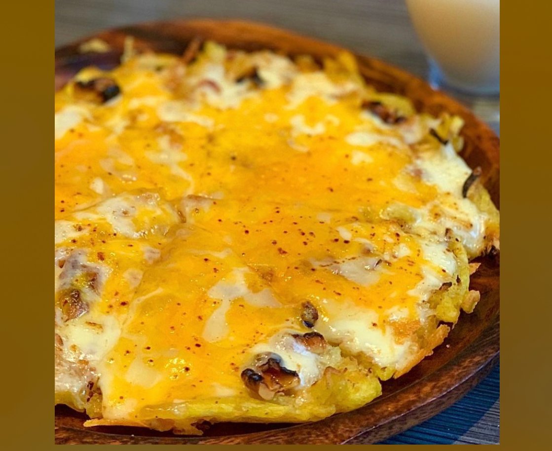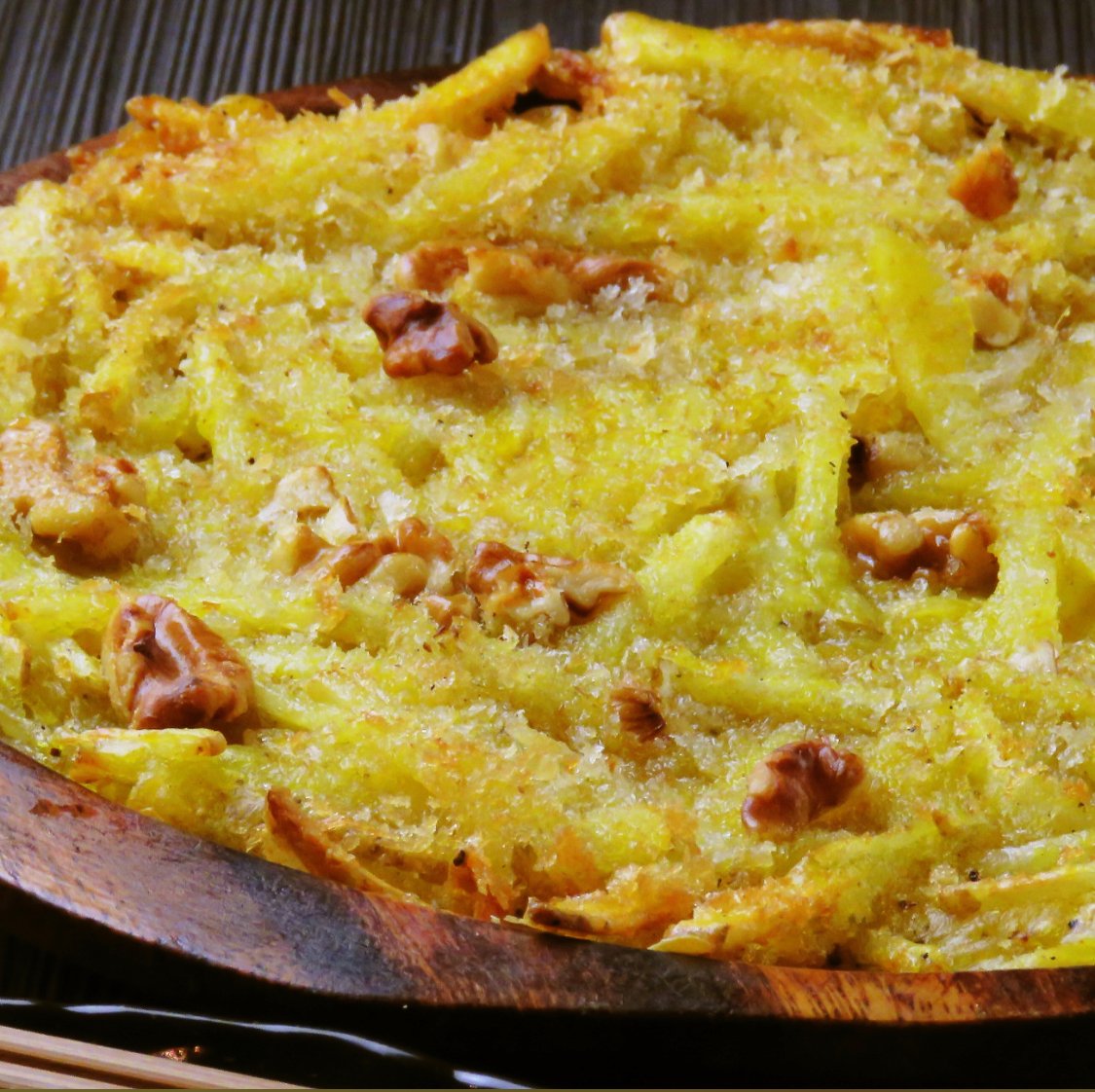 シャキシャキ千切りのじゃがいもとモチモチ生地、香ばしいクルミがのって食感◎ Pizzaのような美味しさの2種チーズトッピングもおすすめ!
