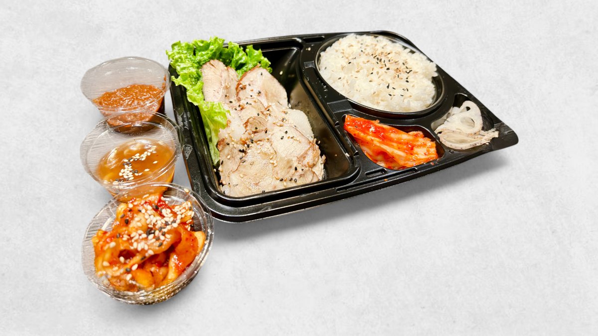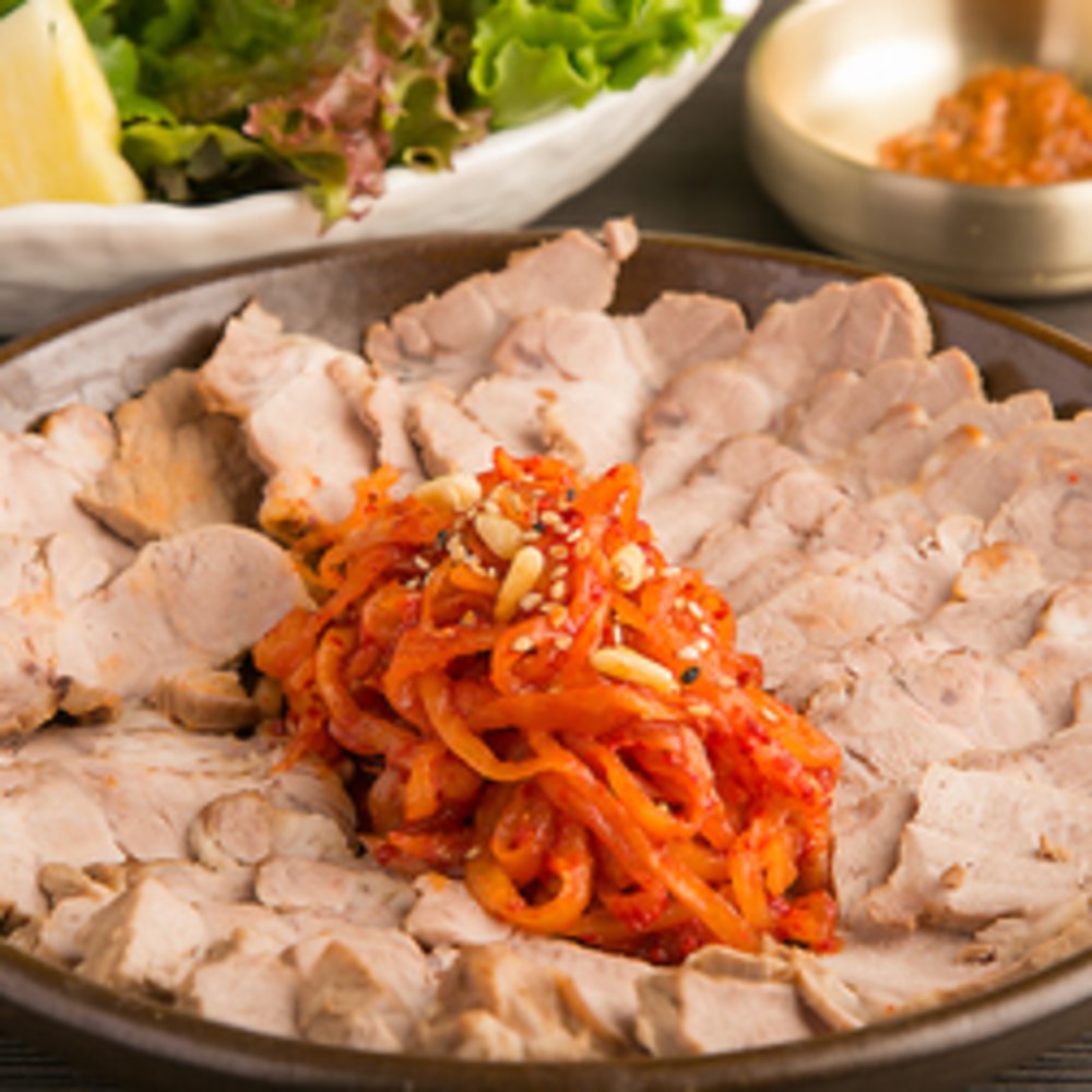 茹で豚は脂肪が少ない部位を薄めにスライスしているのでしっとりやわらかく、1枚だけ食べるのもよし、2~3枚ほおばるのもよし 付け味噌・ポッサムキムチを乗せて野菜に巻いて食べるとシ・ア・ワ・セ ポッサム専用キムチは自家製でポッサム肉の甘みが引き立つように仕込まれた名わき役です。コリコリ食感は自家製ならでは 韓国で配達といえば [ポッサム] !!※写真は2人前です。