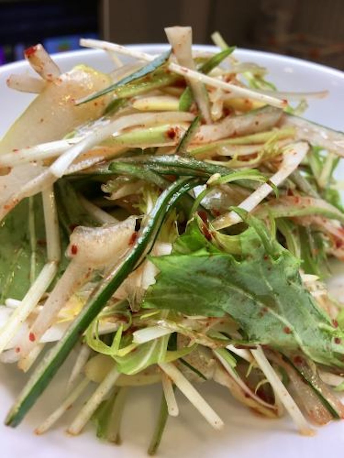 ゴマ油だれの韓国定番のサラダ、ほんの少し唐辛子の辛さが◎。肉料理には必須アイテム!