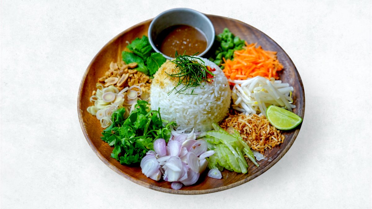 タイ南部の特有の旨味の塊のようなブードゥーソース(エビとハーブの少し甘めのソース)をかけて色とりどりの野菜、ハーブとご飯を混ぜて食べるヘルシー混ぜご飯です。