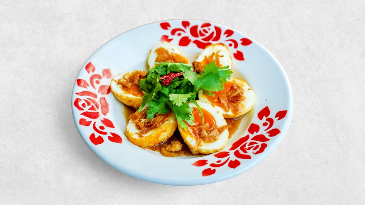 揚げた半熟卵をタマリンド(タイの甘酸っぱいフルーツ)のソース、フライドオニオンと一緒に食べるタイのストリートではとてもポピュラーの前菜。