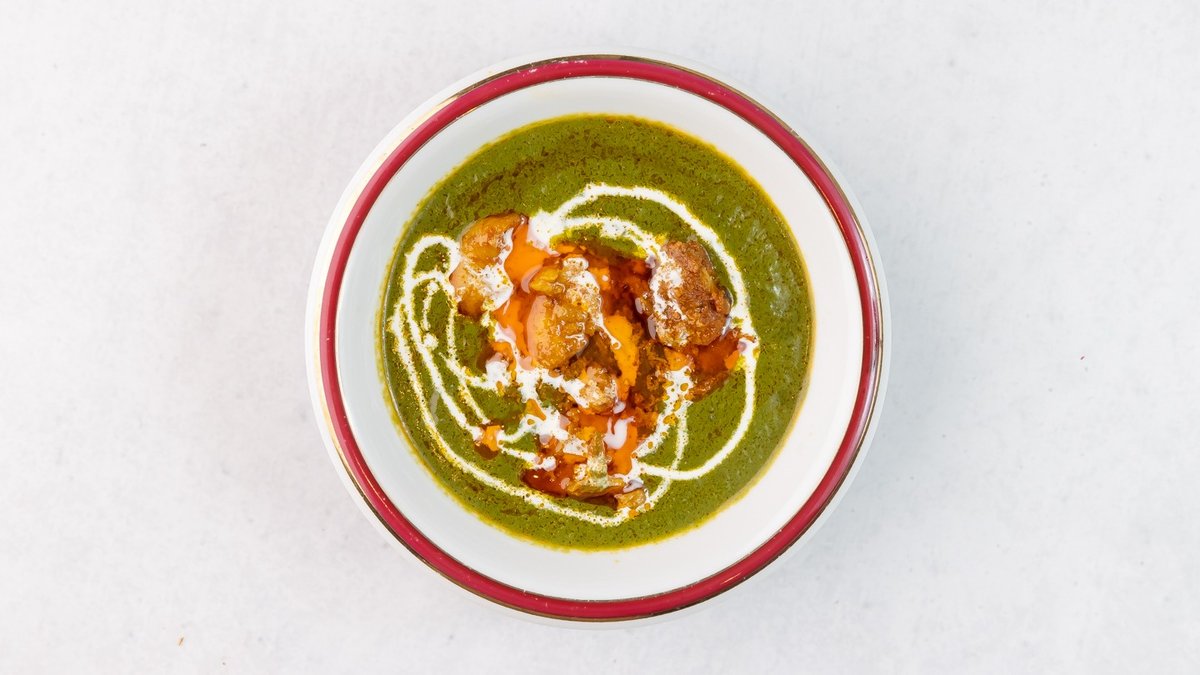 柔らかいチキンとほうれん草がたっぷり入ったグリーンカレーです。/ A green curry with plenty of soft chicken and spinach.