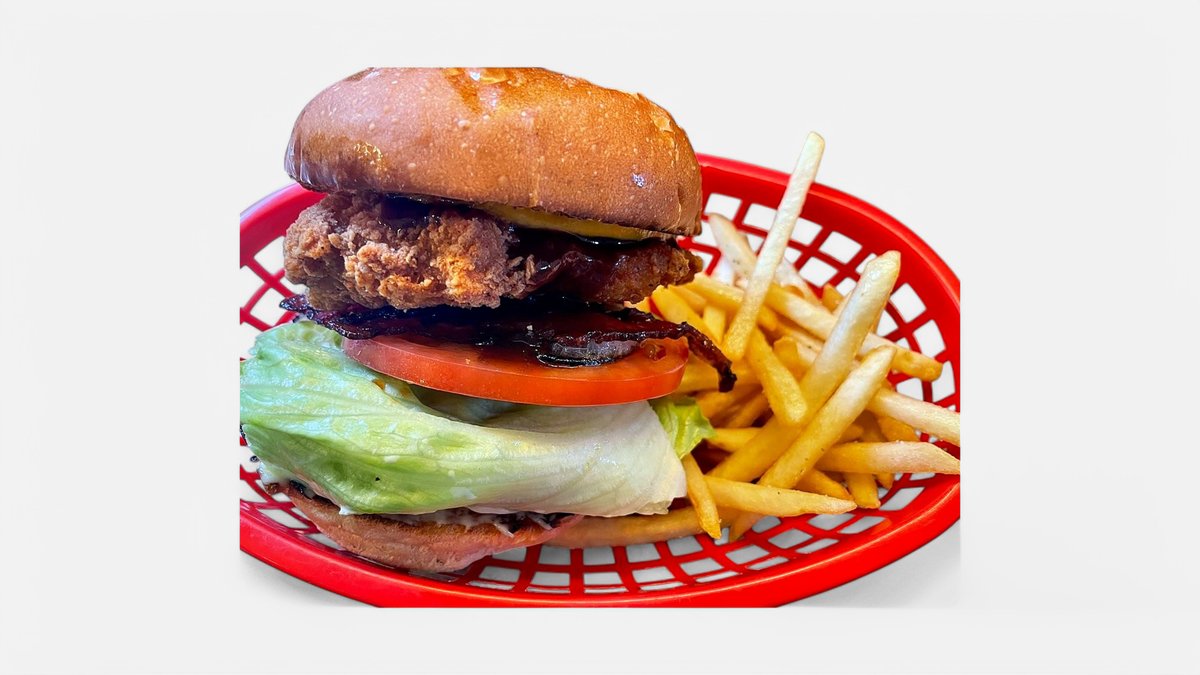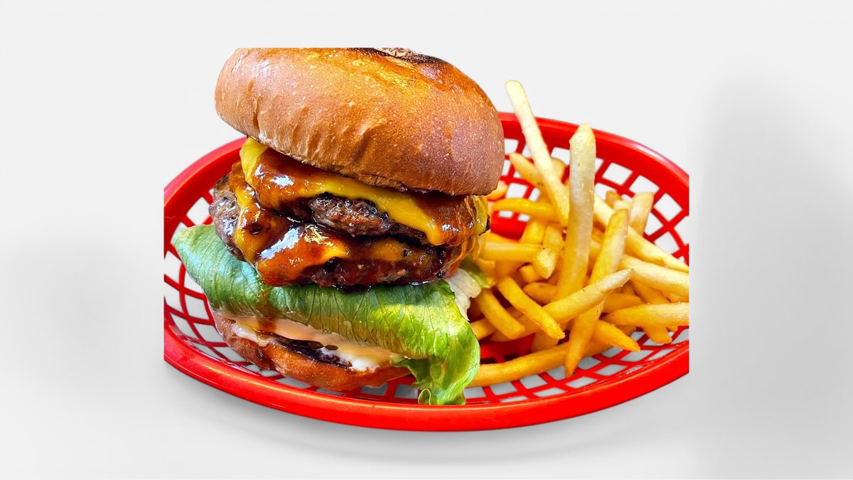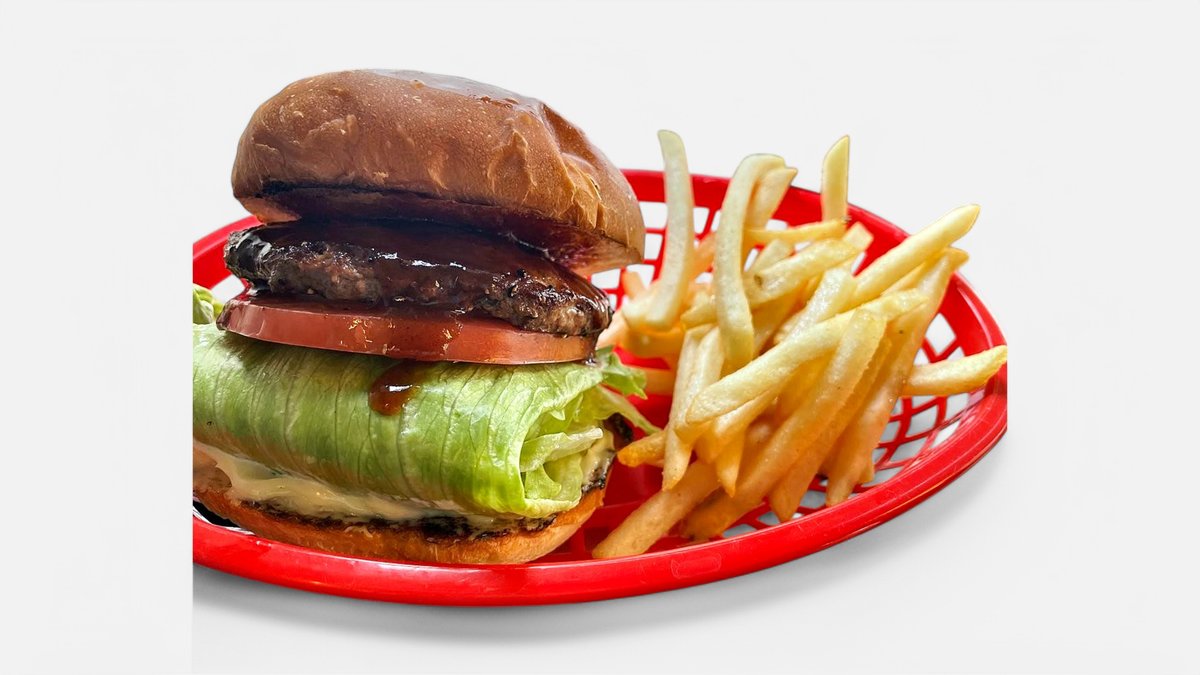 当店自慢のオリジナルハンバーガーをご賞味ください。うれしい全品ポテト付き。