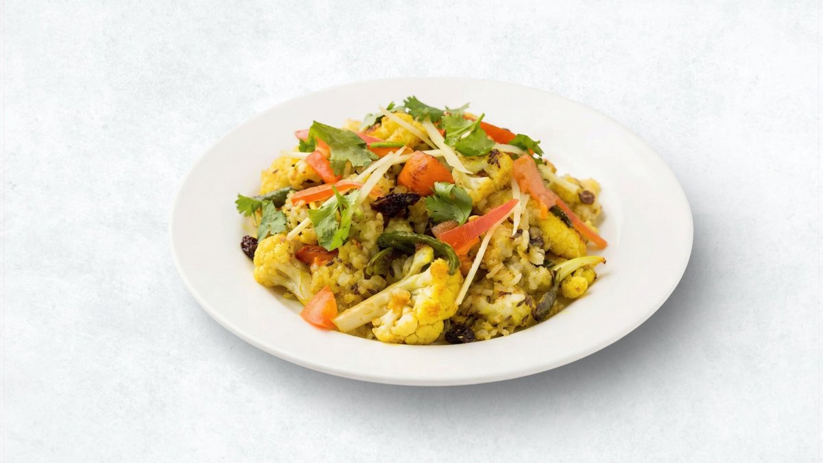 Curry with delicious cauliflower and steamed potatoes cooked in spices. Cooked using Indian's steam method, the fragrance of the spices is drawn out in this classic Indian dish. / スパイスで香り高く仕上げたカリフラワーと蒸しじゃがいものカレー。インド式の蒸し調理で、食材の旨みとスパイスの香りがしっかり引き立つ伝統的な一品です。