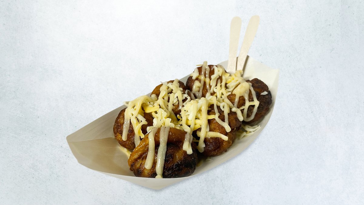 カリッと揚げたえびやきに、チーズとチーズソースを乗っけました。