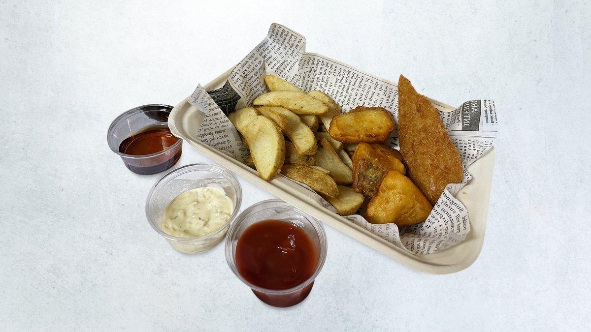 ナチュラルフライドポテト150gと白身魚のフリッターとアジフライの盛り合わせです。トマトケチャップ・タルタルソース・モルトビネガー付きです。