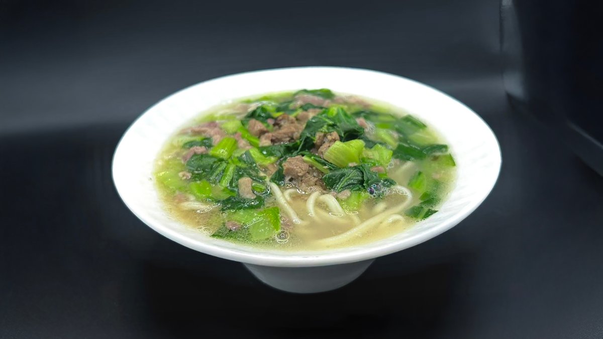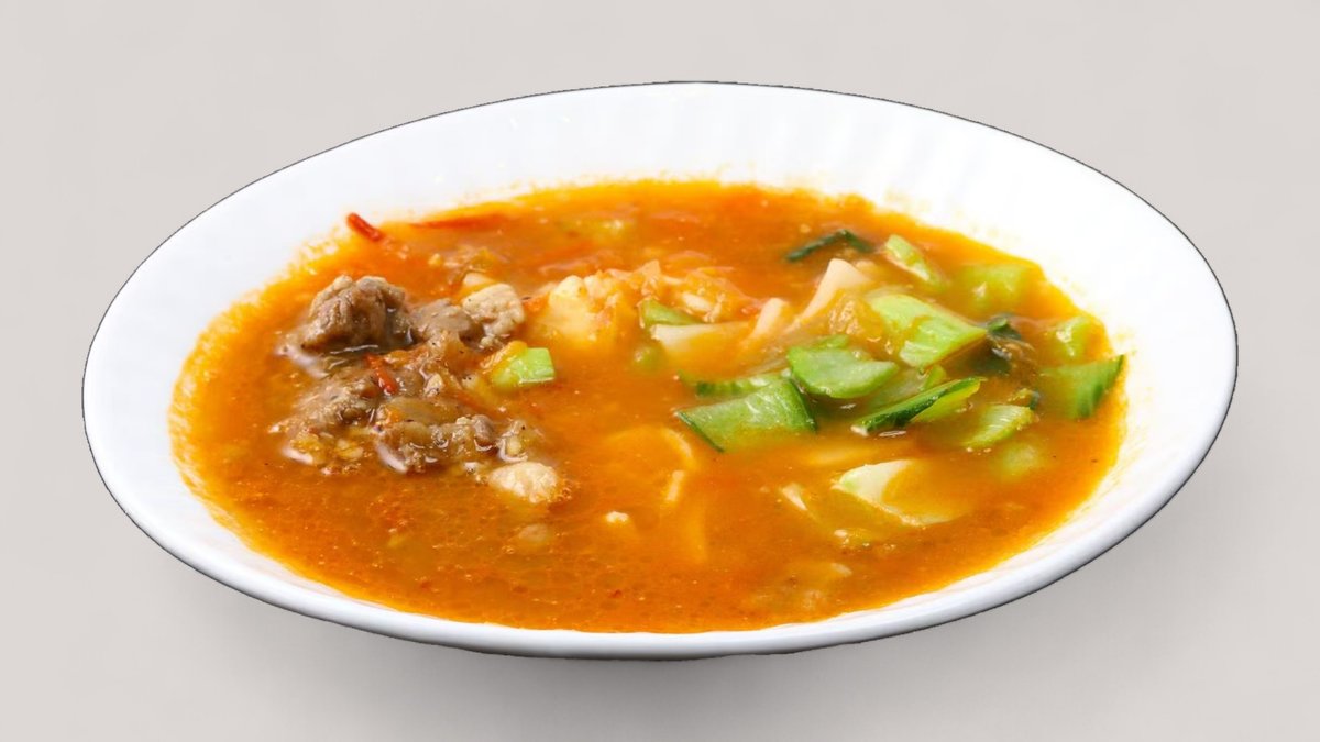 手延べ麺を千切って、さっぱりしたトマトベースのスープ、つるっとした麺の食感が楽しめる、コク深いスープの一杯、辛くない。