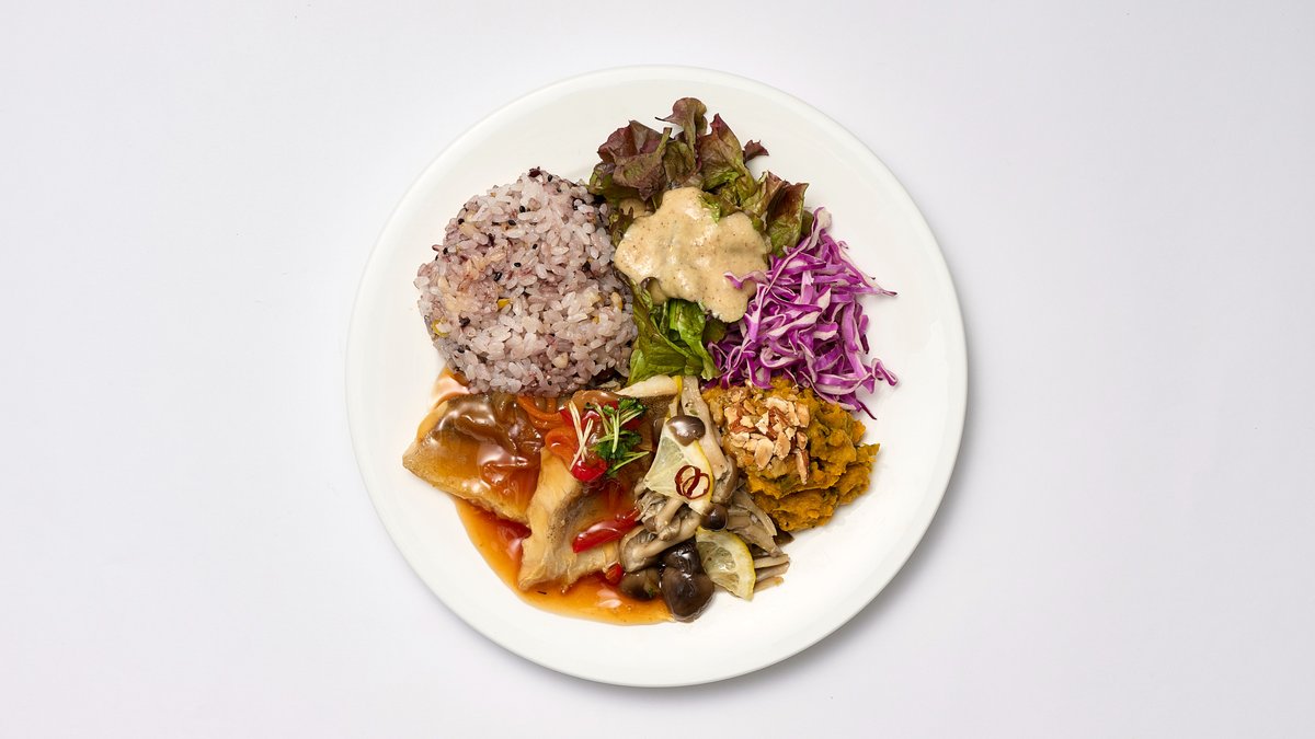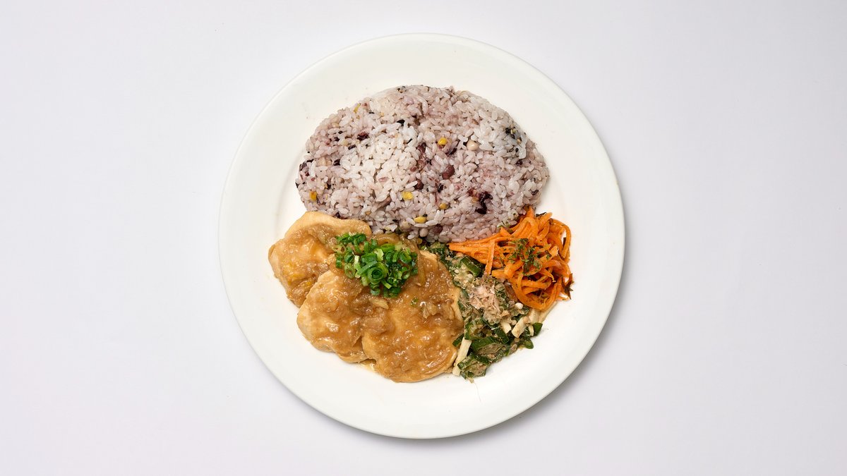 栄養豊富な十五穀米と新鮮な彩りサラダを一度にお楽しみいただけます。バランスの取れた一皿です。 / Enjoy nutritious 15-grain rice and a fresh, colorful salad. This plate offers a balanced meal.