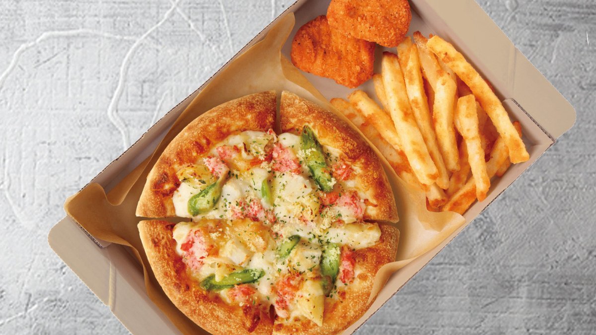 <組合せ> [Pサイズ(約15cm)]紅ずわい蟹のグラタンピザ」+「ハットフライポテト」+「チキンナゲット2ピース」 (ピザのトッピング:ペンネホワイトソース/アスパラ/イカ/紅ずわい蟹/パルメザンチーズ/パセリ)