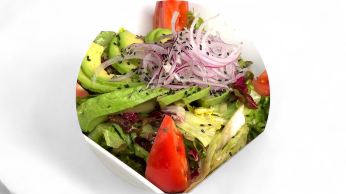 レタス、トマト、赤玉ねぎ、アボガドがたっぷり。醤油ドレッシングにゴマも入っています。