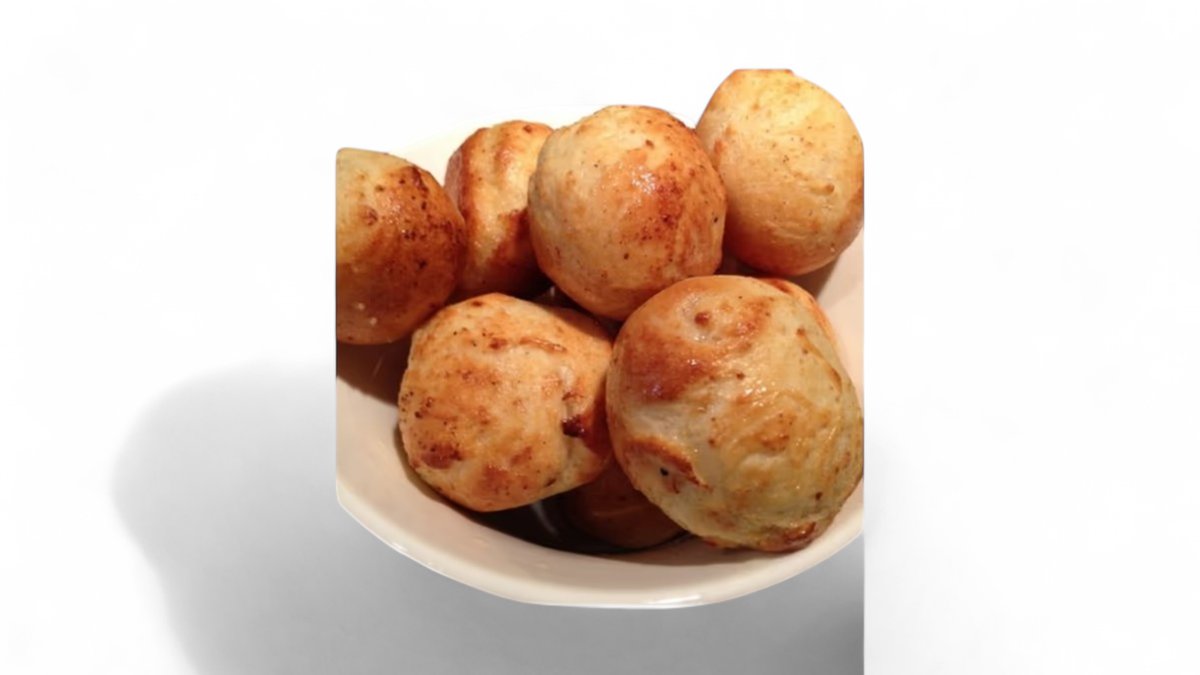 ドウボール(小さなボール型パン)をガーリックバターにからめてオープンで焼いたあと、再びガーリックバターにディップしました。