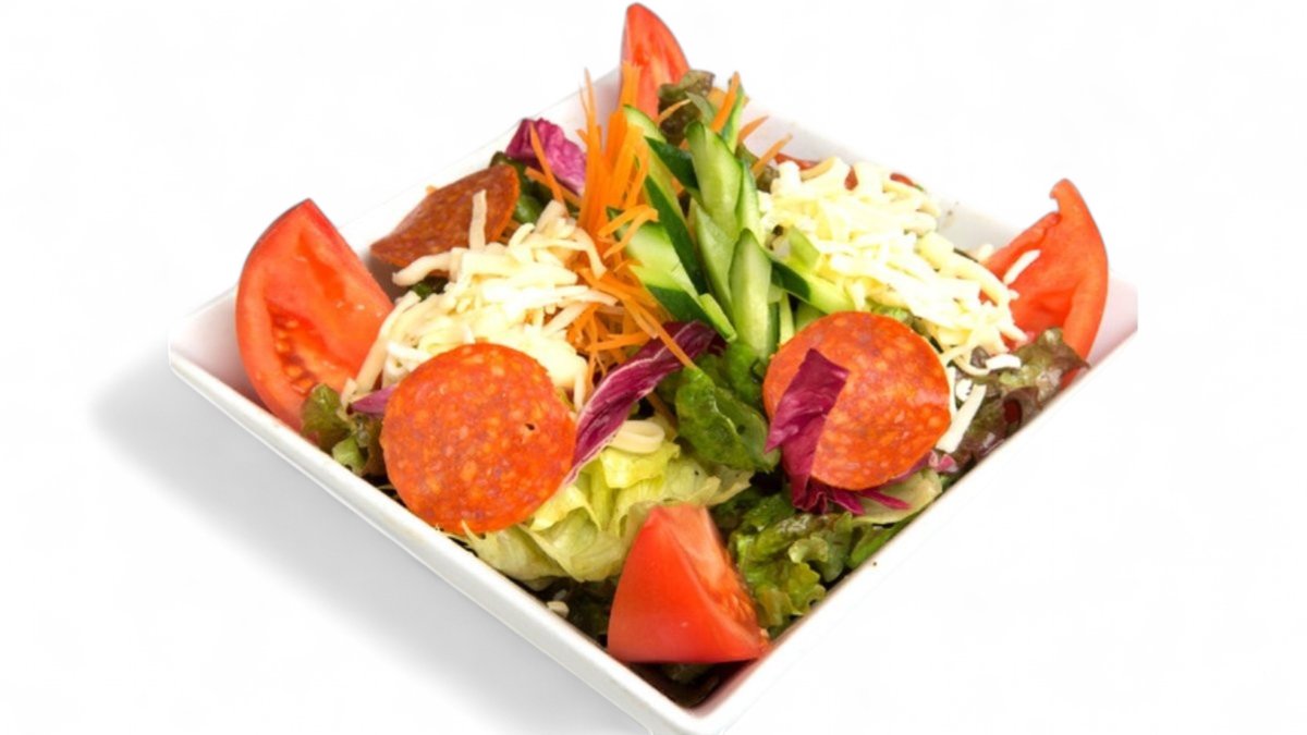 トマト、レタス、キュウリ、にんじん、ピザチーズ、そしてペパロニの目にも楽しいサラダです。