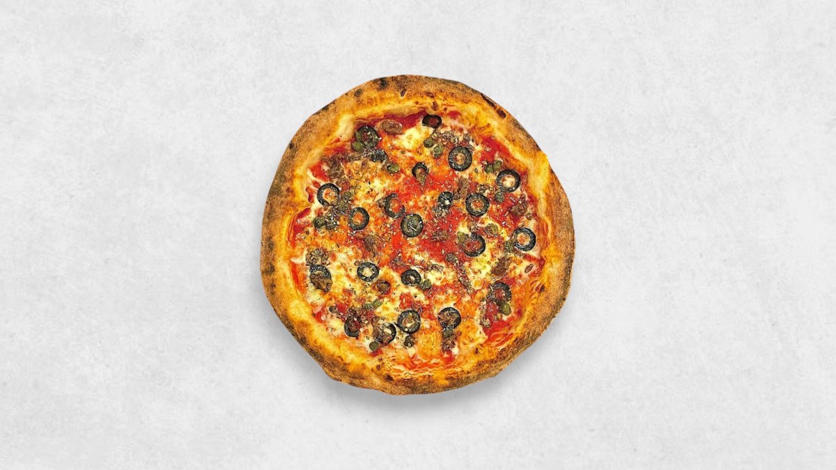 (トマトソース、 モッツァレラ、 アンチョビ、 ケッパー、 ガーリック、 オリーブ、 オレガ ノ、 パルメザン、Tomato Sauce, Mozzarella, Anchovies, Cappers, Garlic, Olives, Oregano, Parmesan)