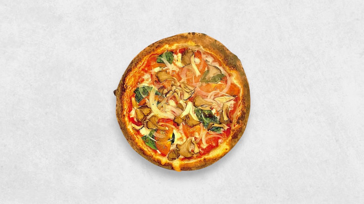 (トマトソース、 モッツァレラ、 バジル、 トマト、 オニオン、 マイタケ、 パルメザン、Tomato Sauce, Mozzarella, Basil, Tomato, Onion, Mushroom, Parmesan)